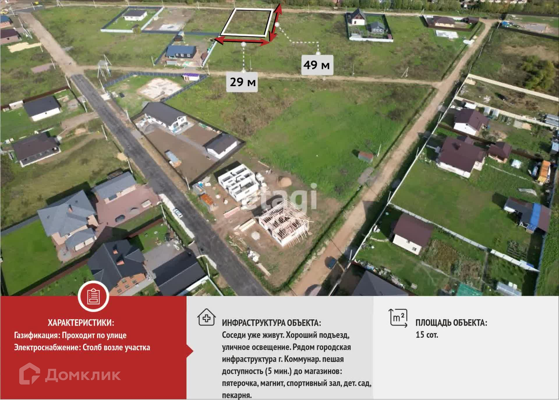 У участка индивидуальный узел учета эл. энергии на 15 кВт, прямой договор со сбытовой компанией, электричество подключено, можно сразу строиться.