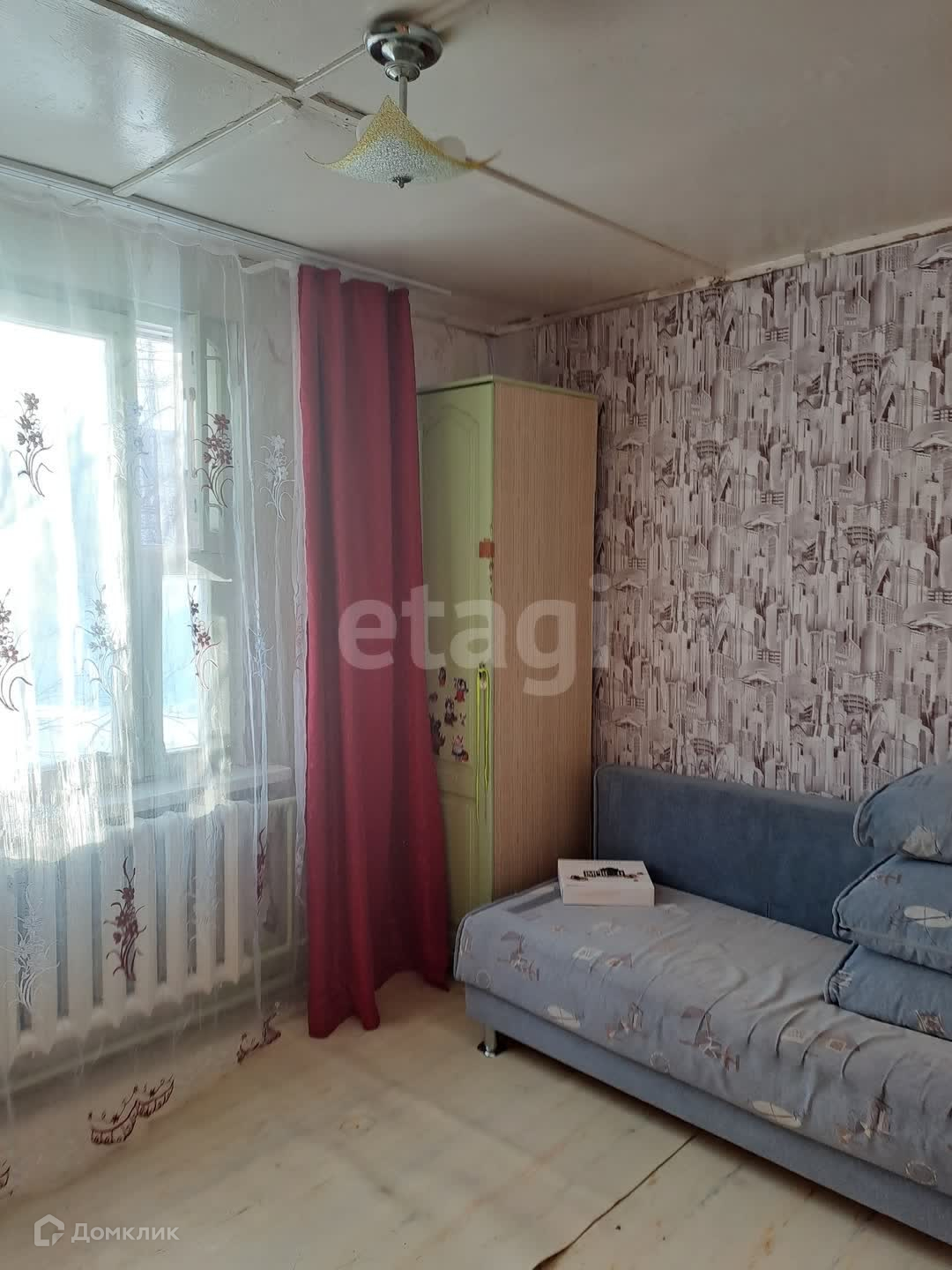 Комната составляет 24,1 квадратных метров. В комнате светло и очень тепло. Есть диван, стол, шкаф. Соседи все хорошие и порядочные люди.