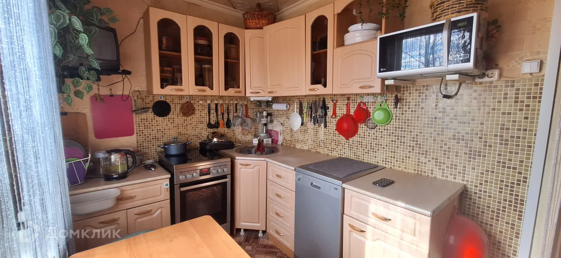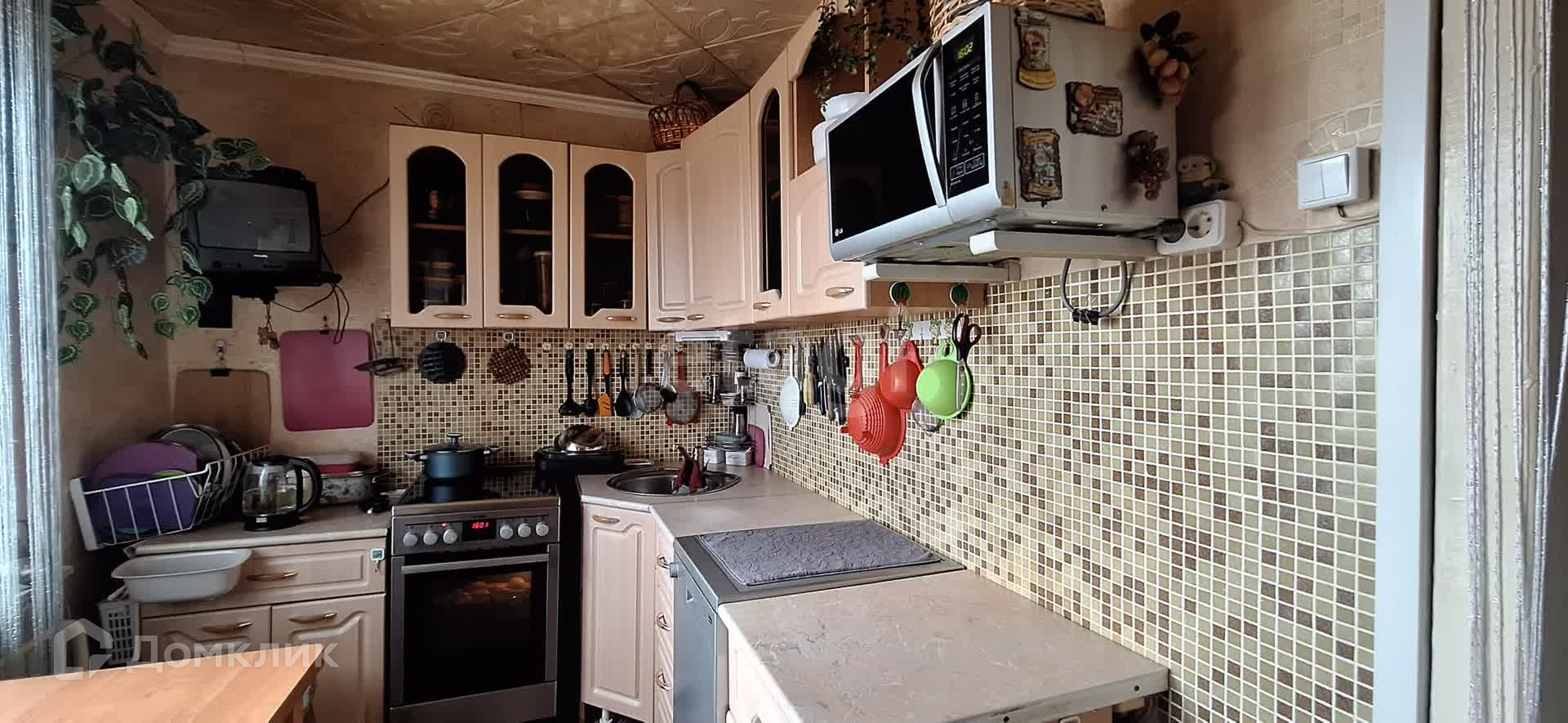 на кухне: кухонный гарнитур, посудомоечная машина, электрическая плита, телевизор, микроволновка,
