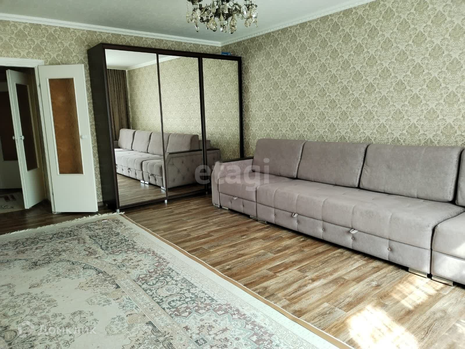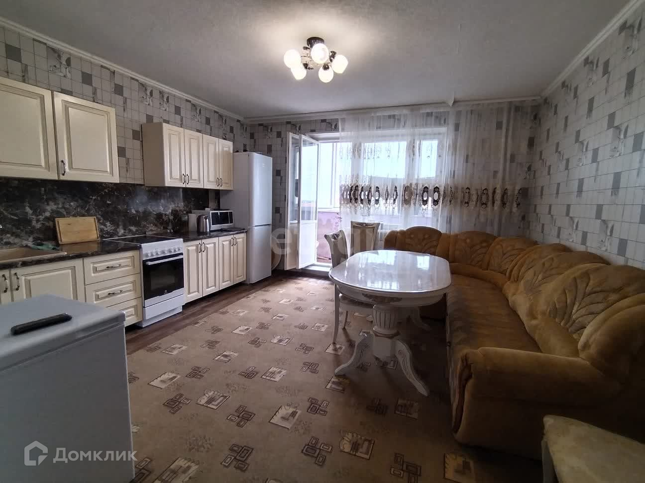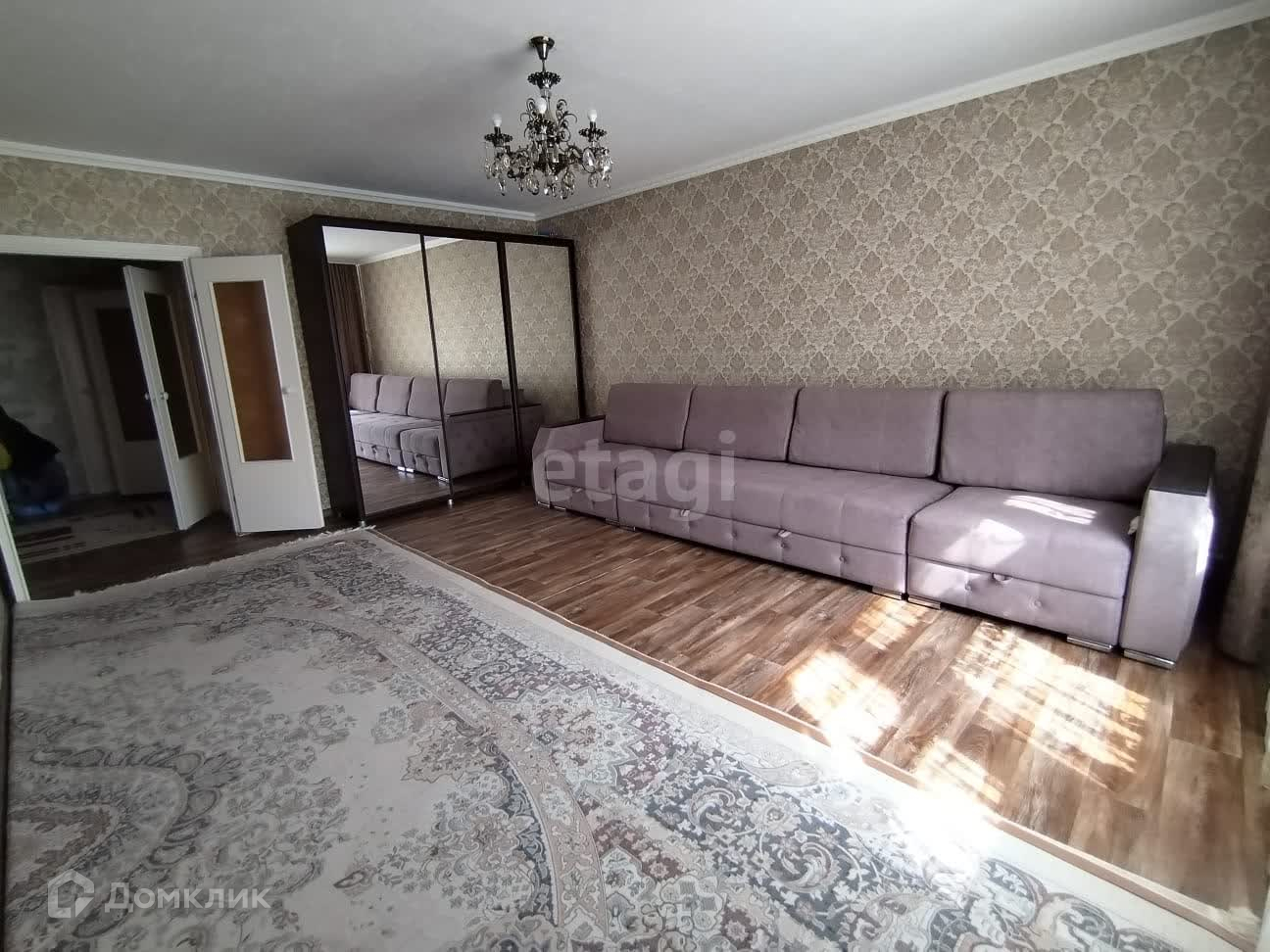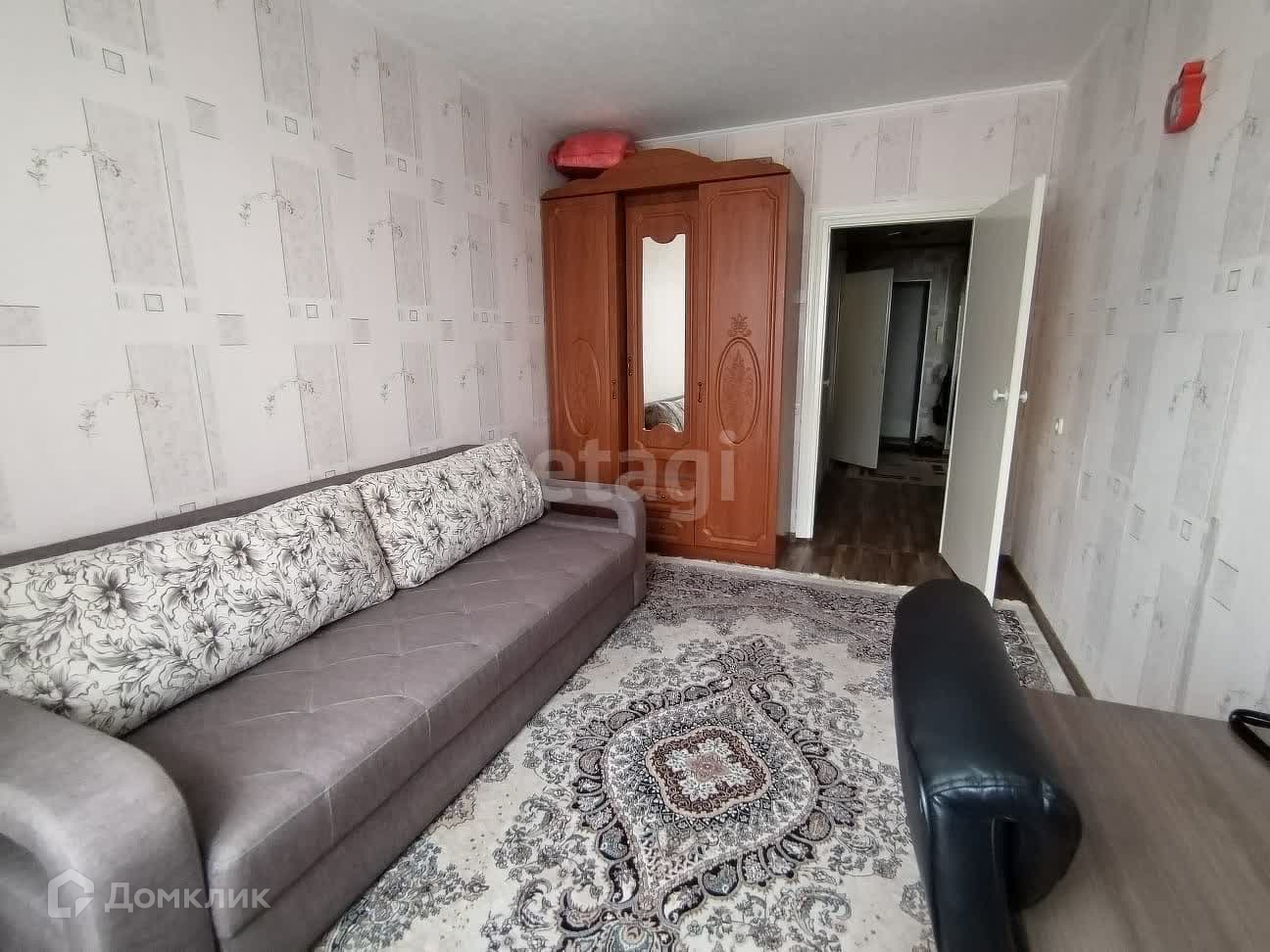 Новым собственникам остаётся кухонный гарнитур, плита, шкаф-купе, диван.