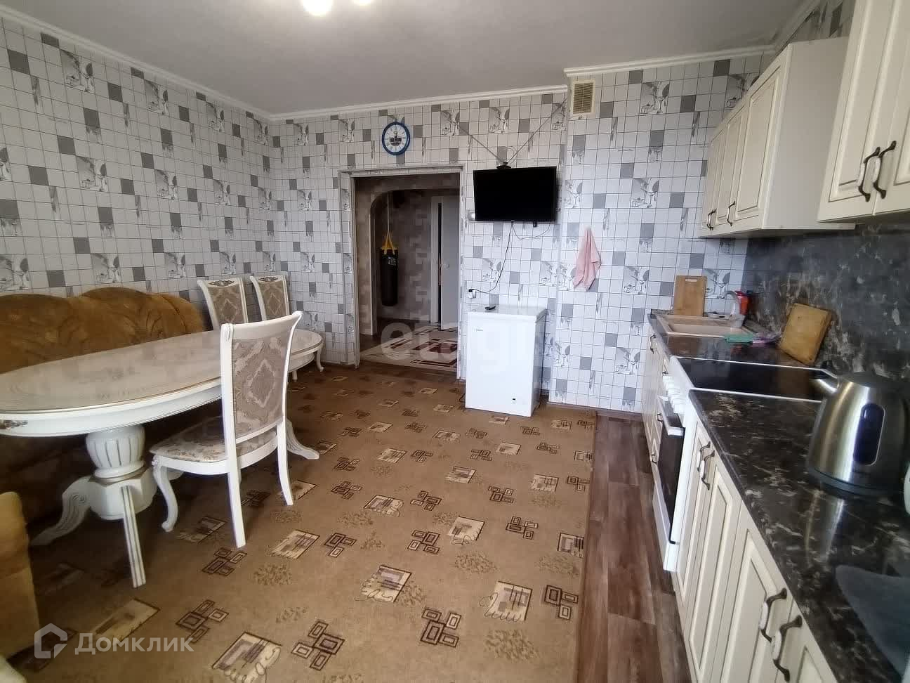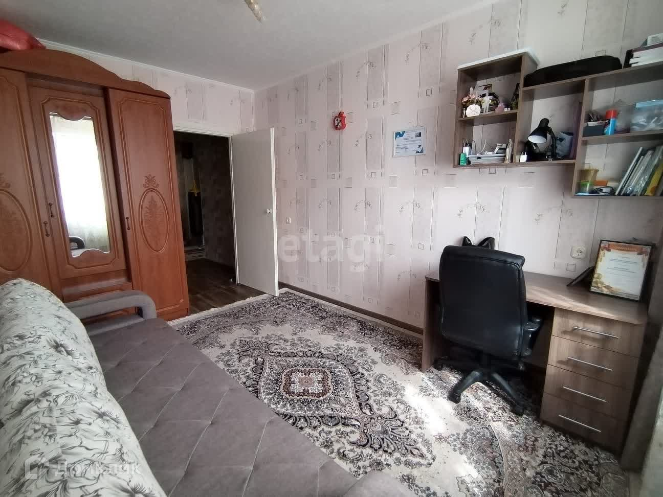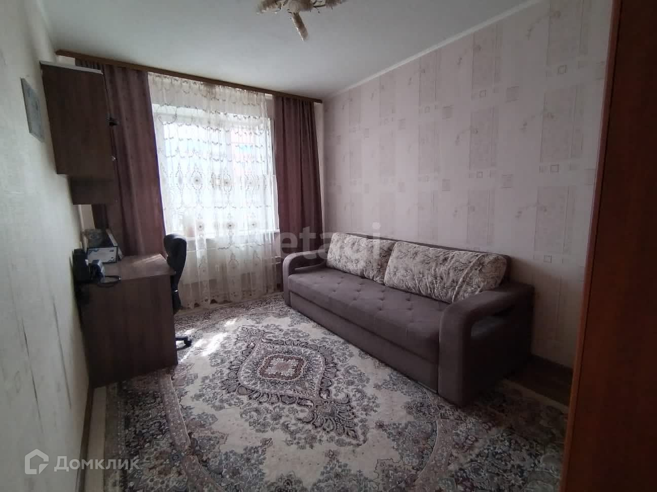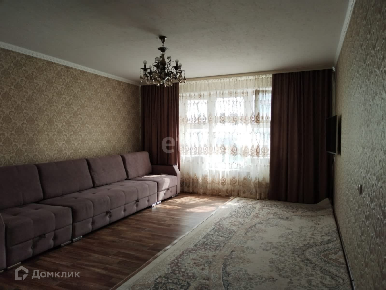 Новым собственникам остаётся кухонный гарнитур, плита, шкаф-купе, диван.