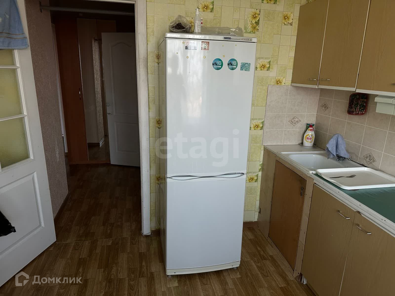В квартире есть холодильник, стиральная машинка, диван и два кресла, телевизор.