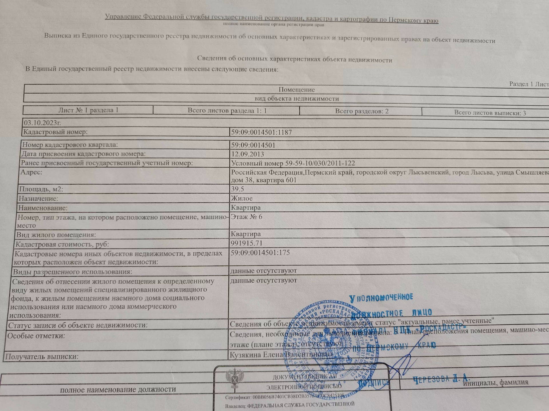 1-комнатная квартира, 39.5 м2, этаж 6 / 9, на продажу в Лысьве, улица Смышляева, 38