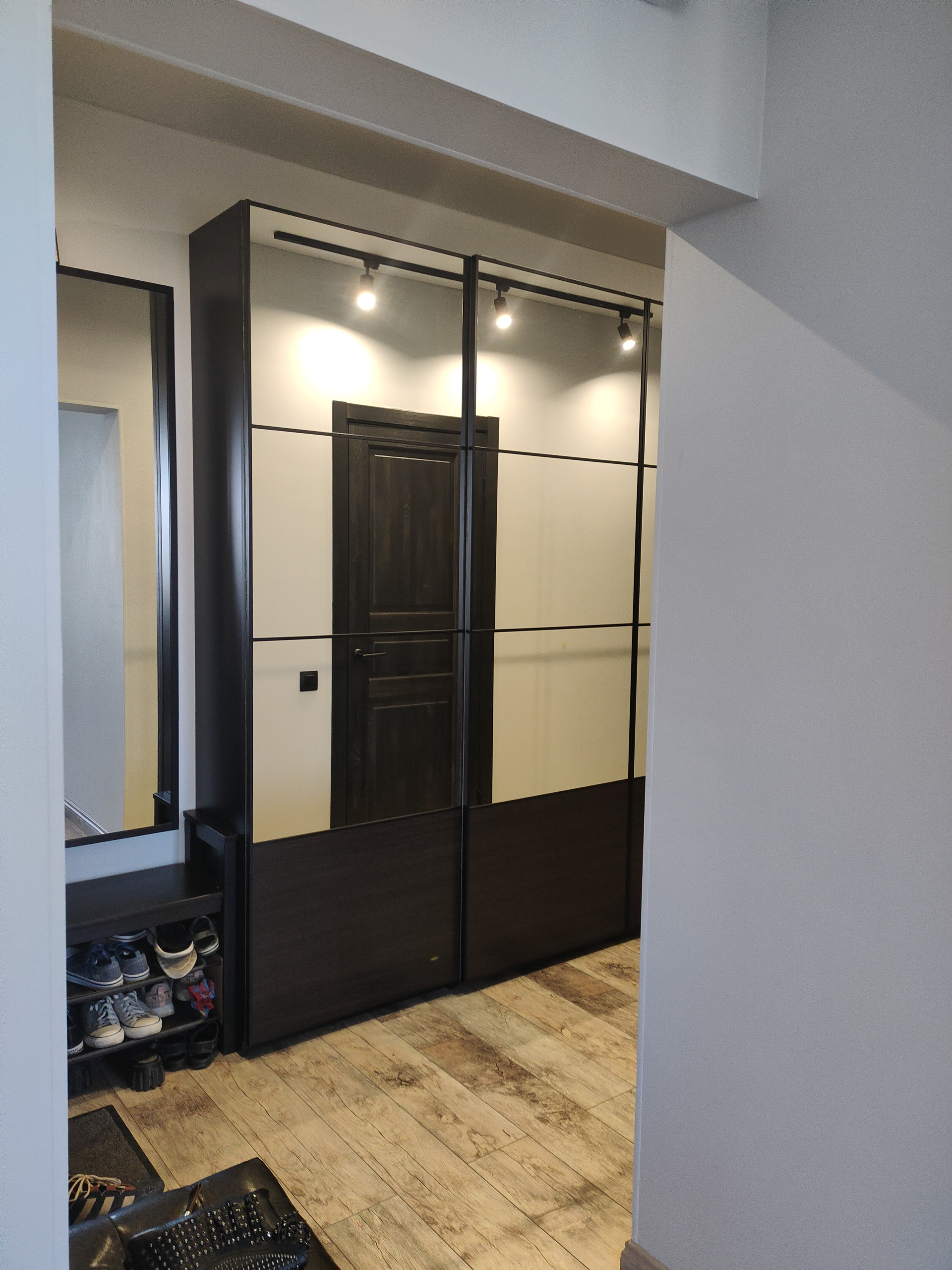В коридоре - большой зеркальный шкаф.