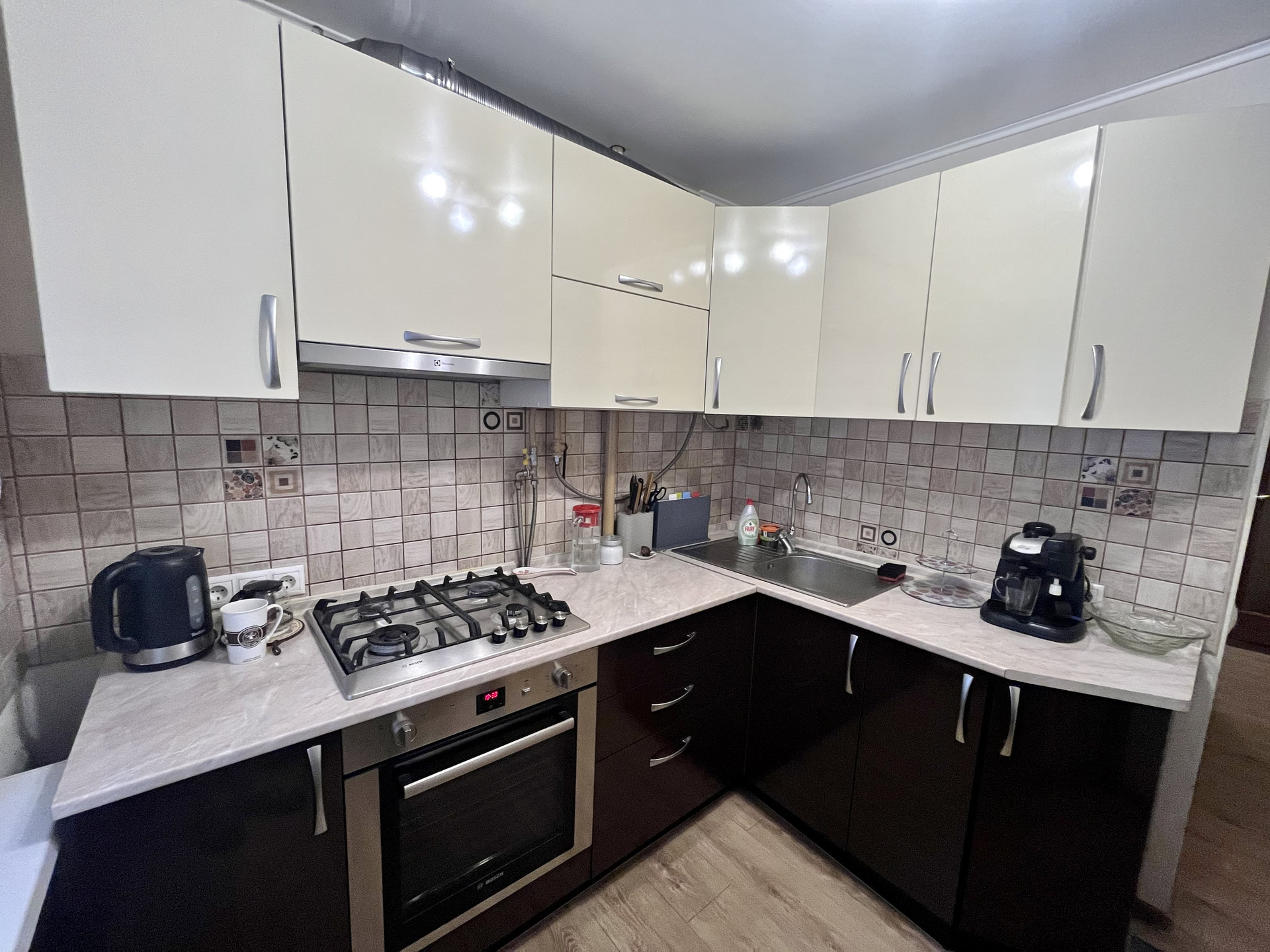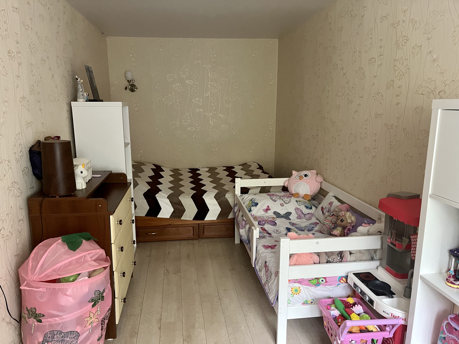 Пол ламинат. В стоимость квартиры входит: встроенный кухонные гарнитур, варочная панель, в маленькой комнате:2-х спальная кровать, комод, в большой комнате: угловой шкаф, стенка полностью, диван, в коридоре: вся мебель.