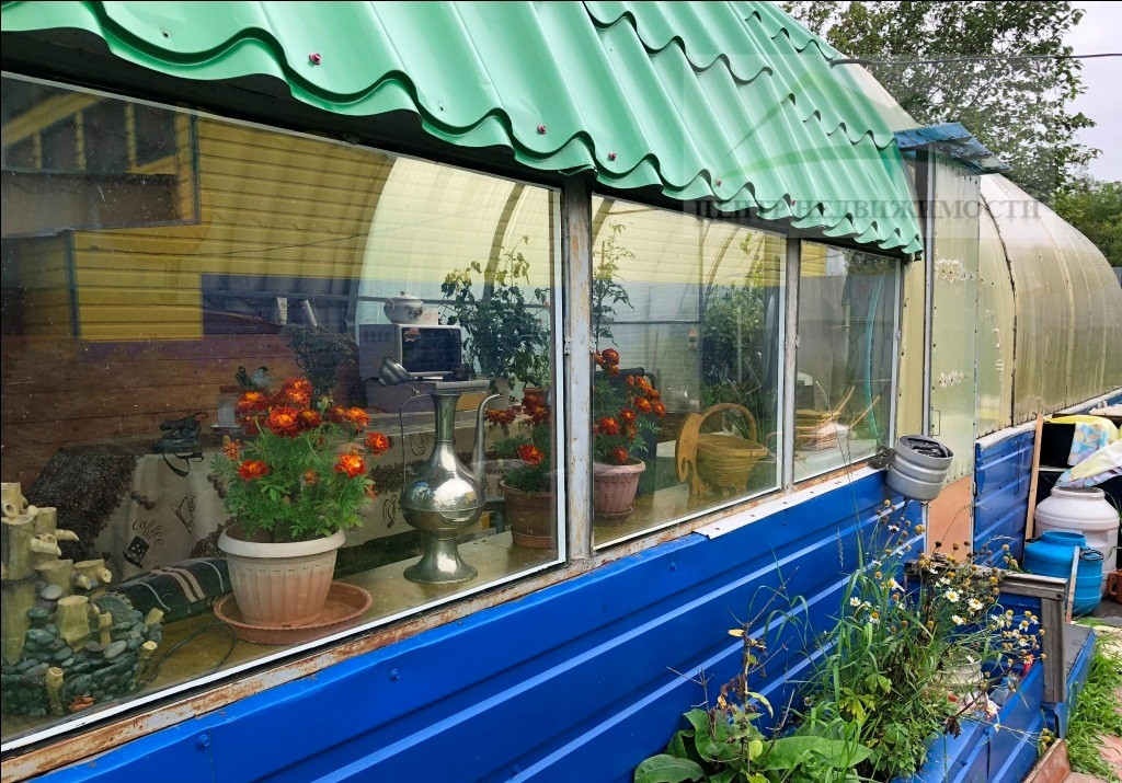 При выходе во двор дома Вы попадаете на участок, с расположенными на нем теплицей и гаражами.