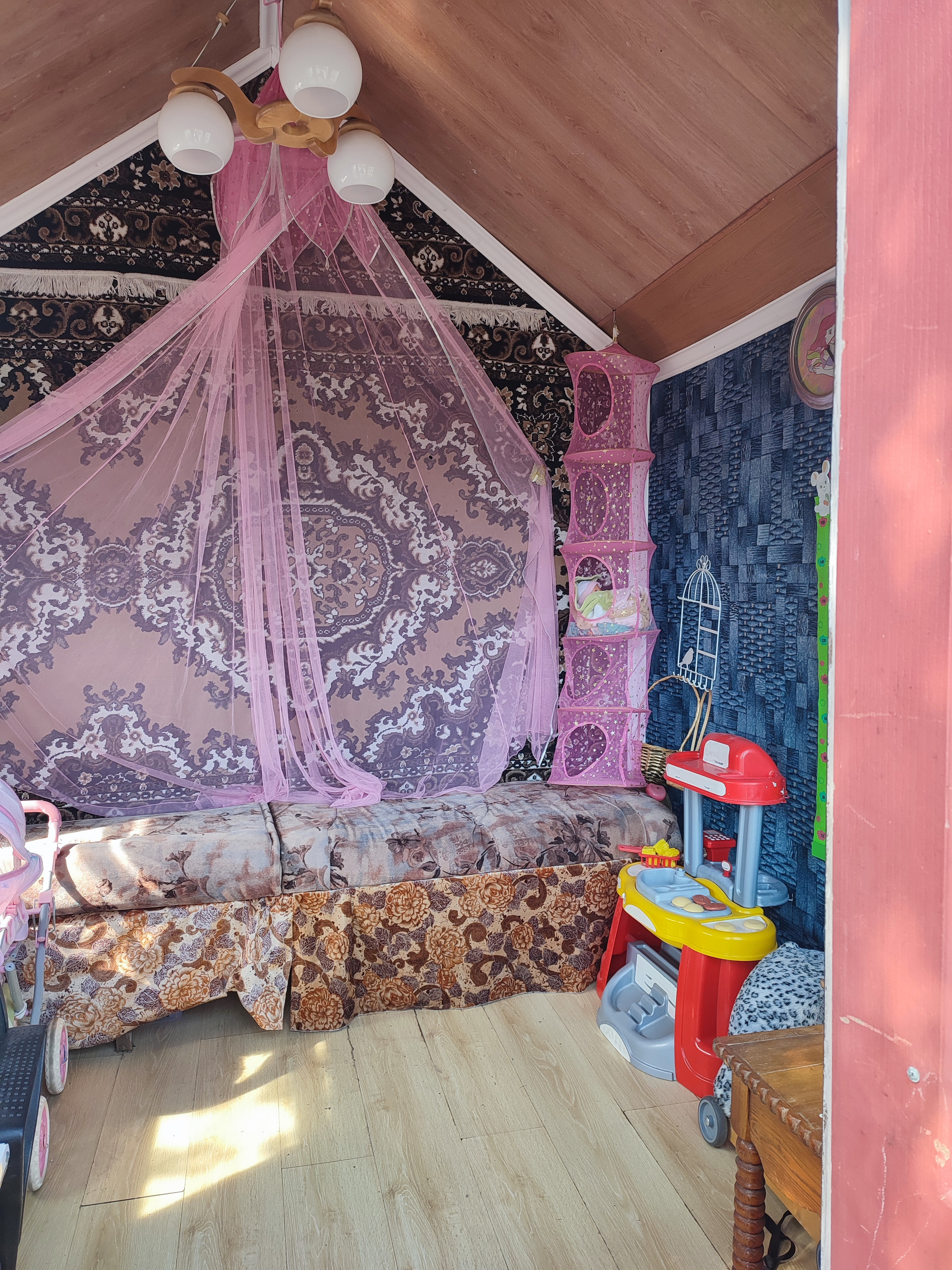 Особое внимание уделено детской зоне. Для любимых внучек был построен домик, в котором дети с удовольствием проводят время.