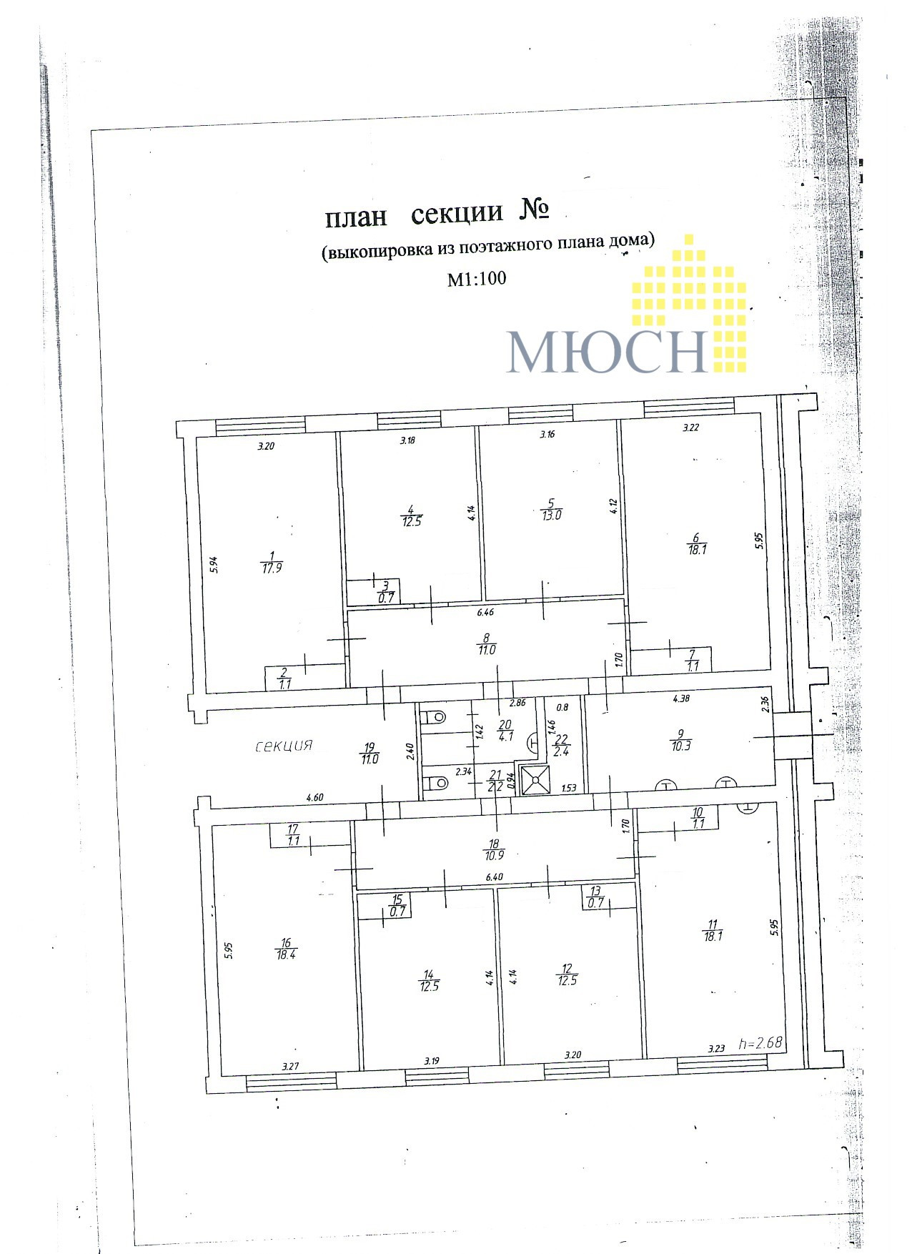 Характеристики коммунальной четырехкомнатной квартиры: общая площадь секции 181.4 кв. м, площадь комнат общая 45,6 кв. м., жилая 30.9 кв. м.