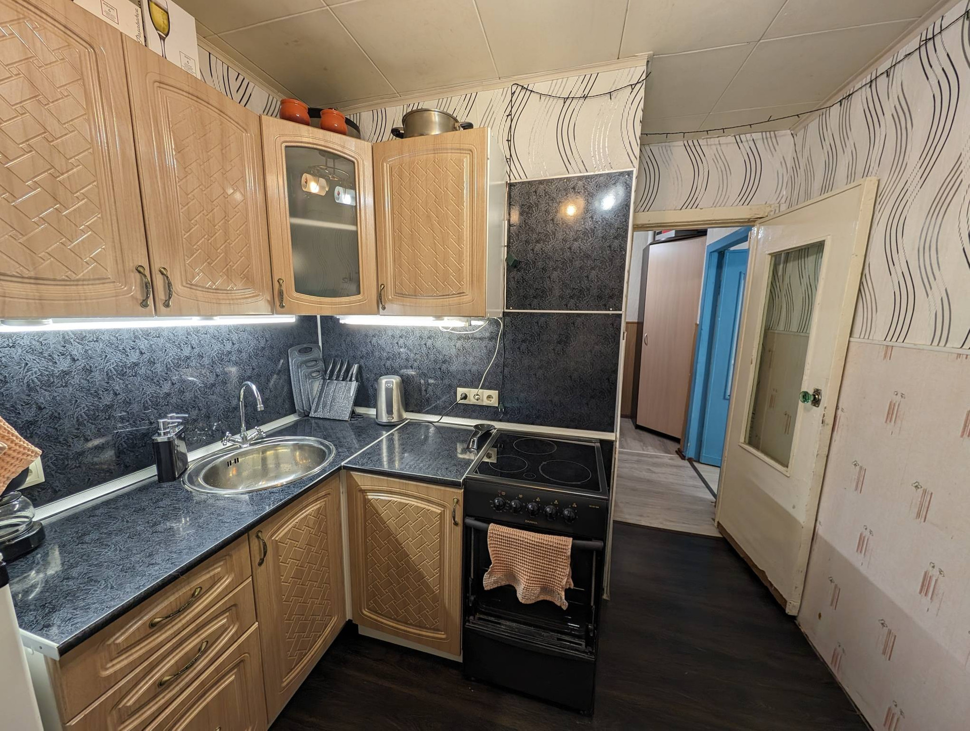 Квартира продается с мебелью и техникой (ПО ДОГОВОРЕННОСТИ): , кухонный гарнитур, плита керамическая, духовой шкаф, микроволновка, кровать, диван, стенка, 2 шкафа платяных, комод и др.