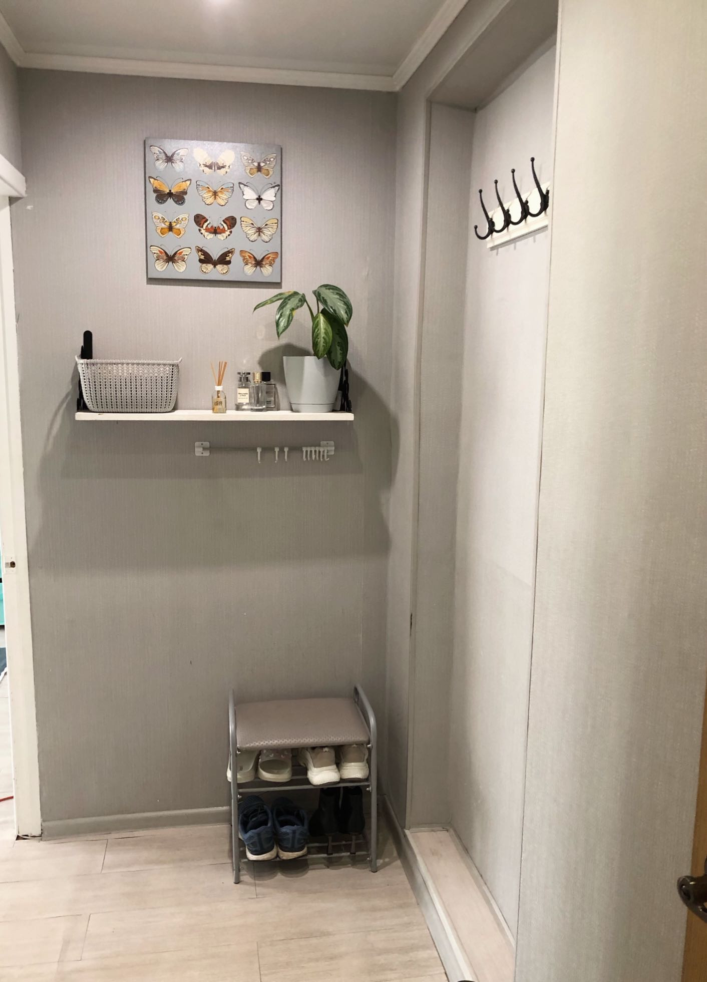 В кладовке оборудован вместительный стеллаж, перекладина для хранения верхней одежды, а также имеется отдельная морозильная камера.