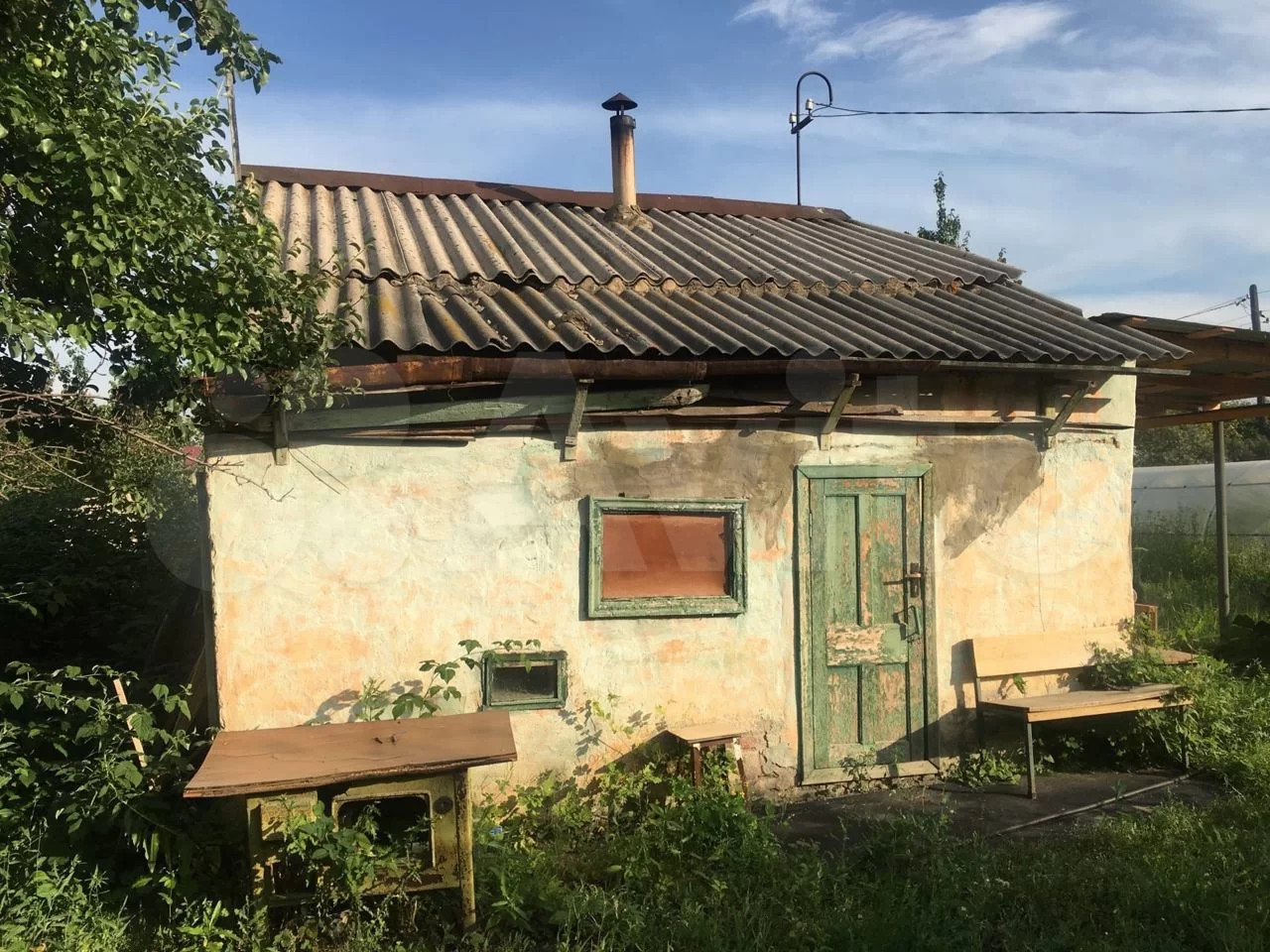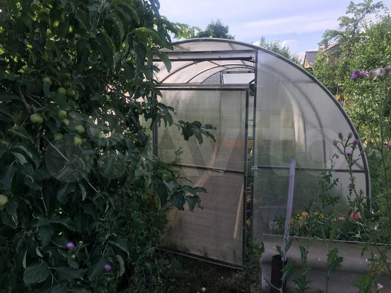 2 теплицы, забор черепица, большой бак под воду + 1 бак под мусор дрова и тд, туалет(необходимо доделать дверь), сделан навес под веранду.
