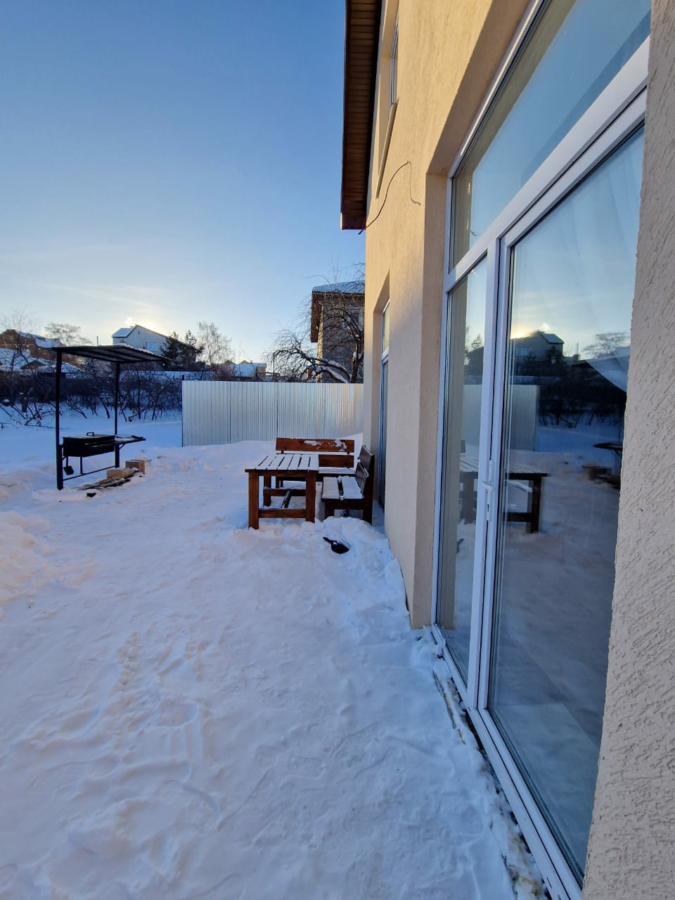 дом 130 кв.м., 2 этажа, 3 отдельные комнаты, 2 сан-узла, кухня гостиная 34 кв.м. подключены все коммуникации, теплый пол на первом этаже, радиаторы, на полу керамогранит,  стены декоративная штукатурка, установлены все двери,  входная дверь с терморазрывом. большие панорамные окна в сад, площадка под террасу, мангальная зона, земля ухожена, есть посадки.