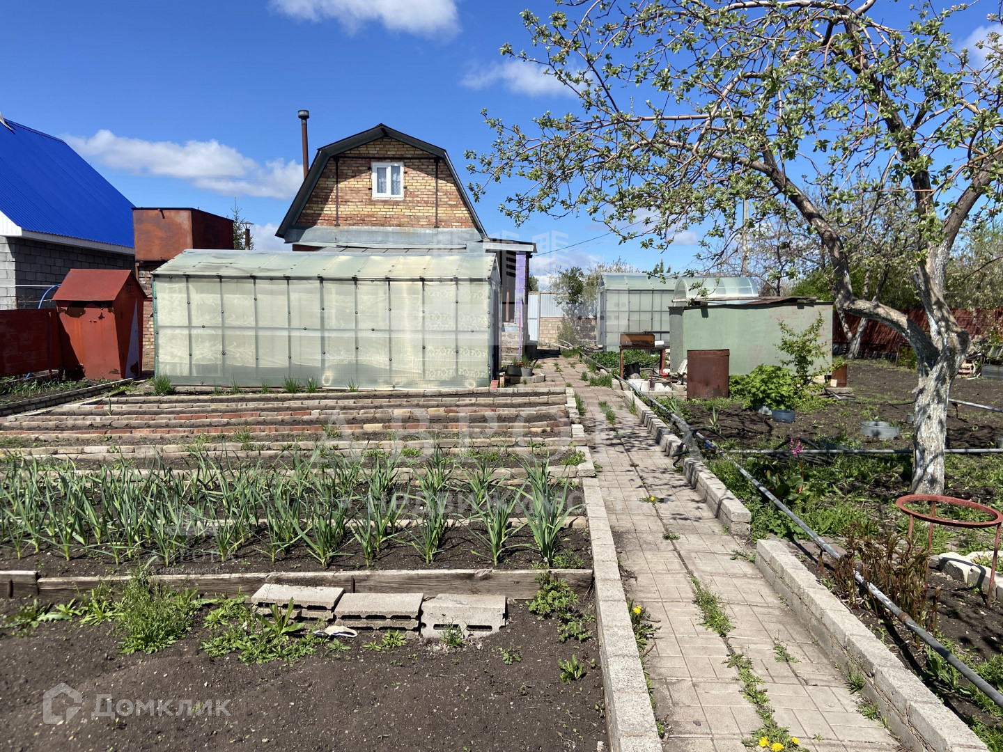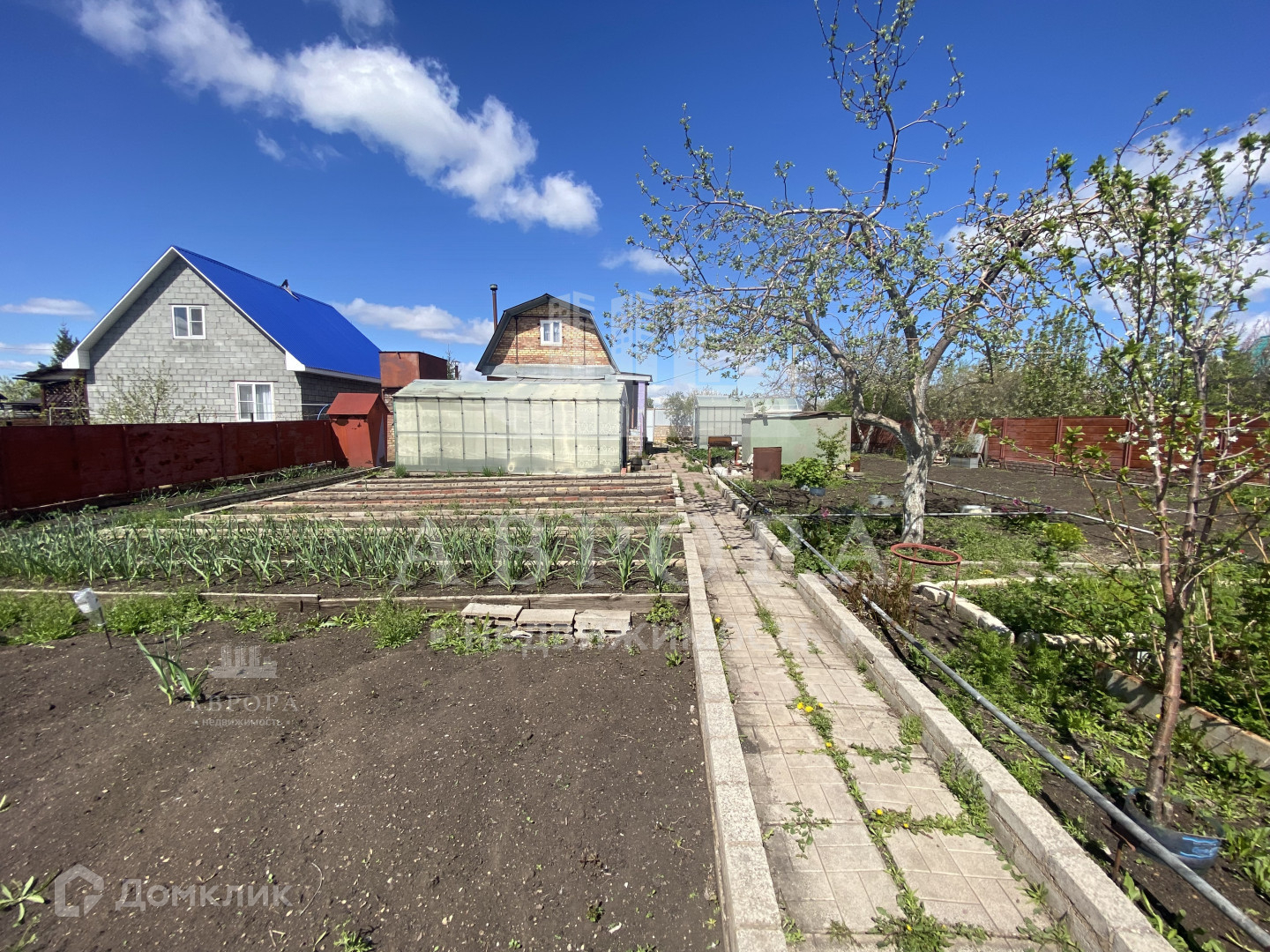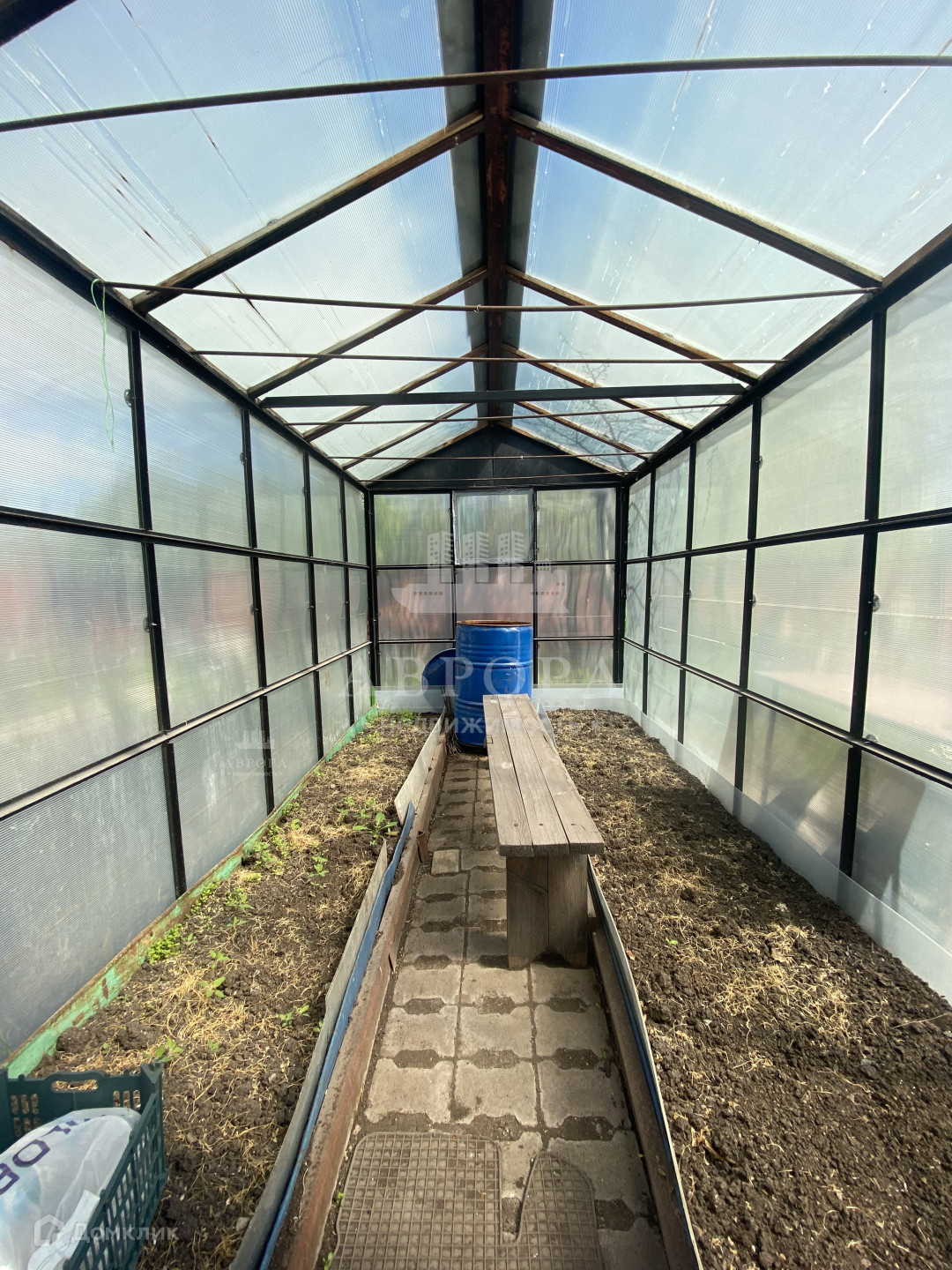 Участок ухожен, не запущен. Есть 2 теплицы (остекленная и из поликарбоната), грядки, а так же различные плодоносящие посадки. Яблони, абрикосы, клубника, жимолость, вишня, розы.