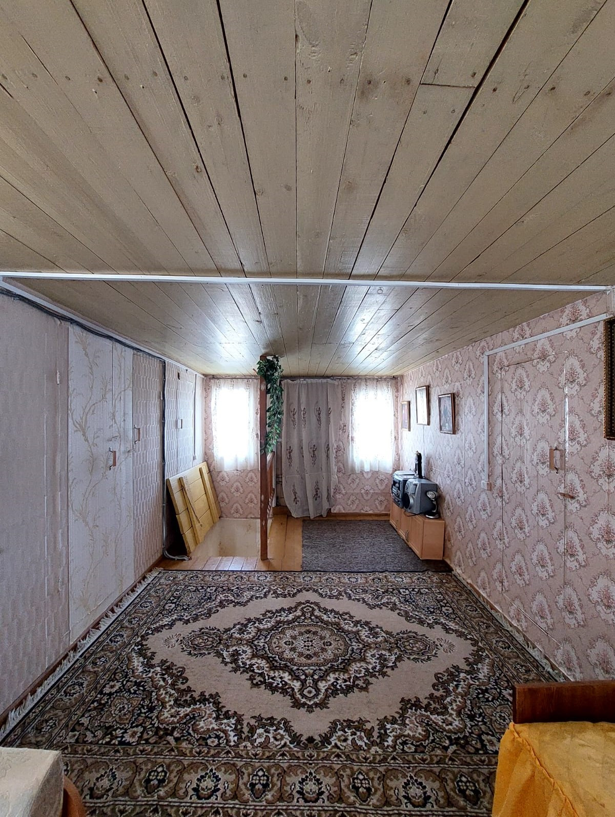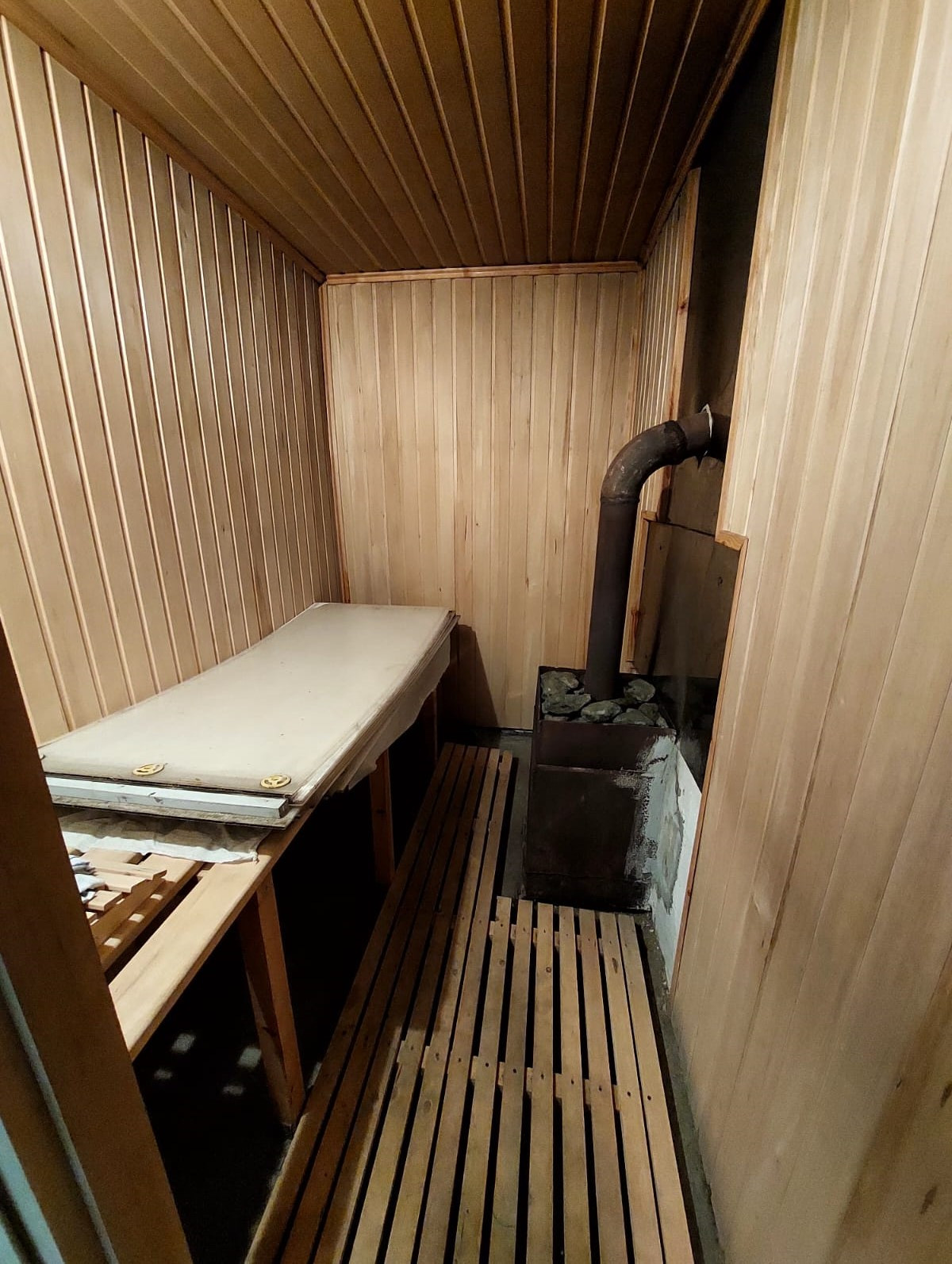 На первом этаже дома расположена баня, отделаная вагонкой, также имеется просторная комната и зона кухни с печкой.
