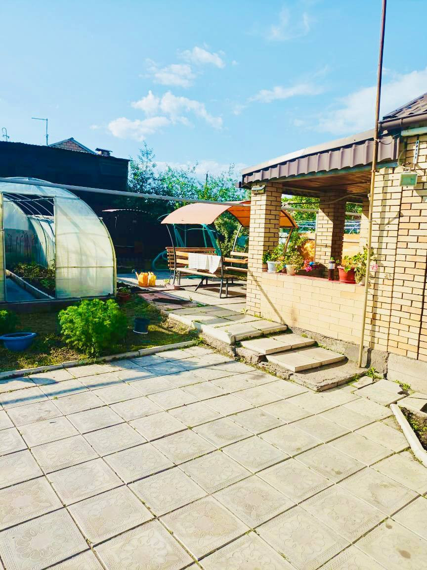 Большой двор вымощен тротуарной плиткой, в огороде имеются две теплицы.