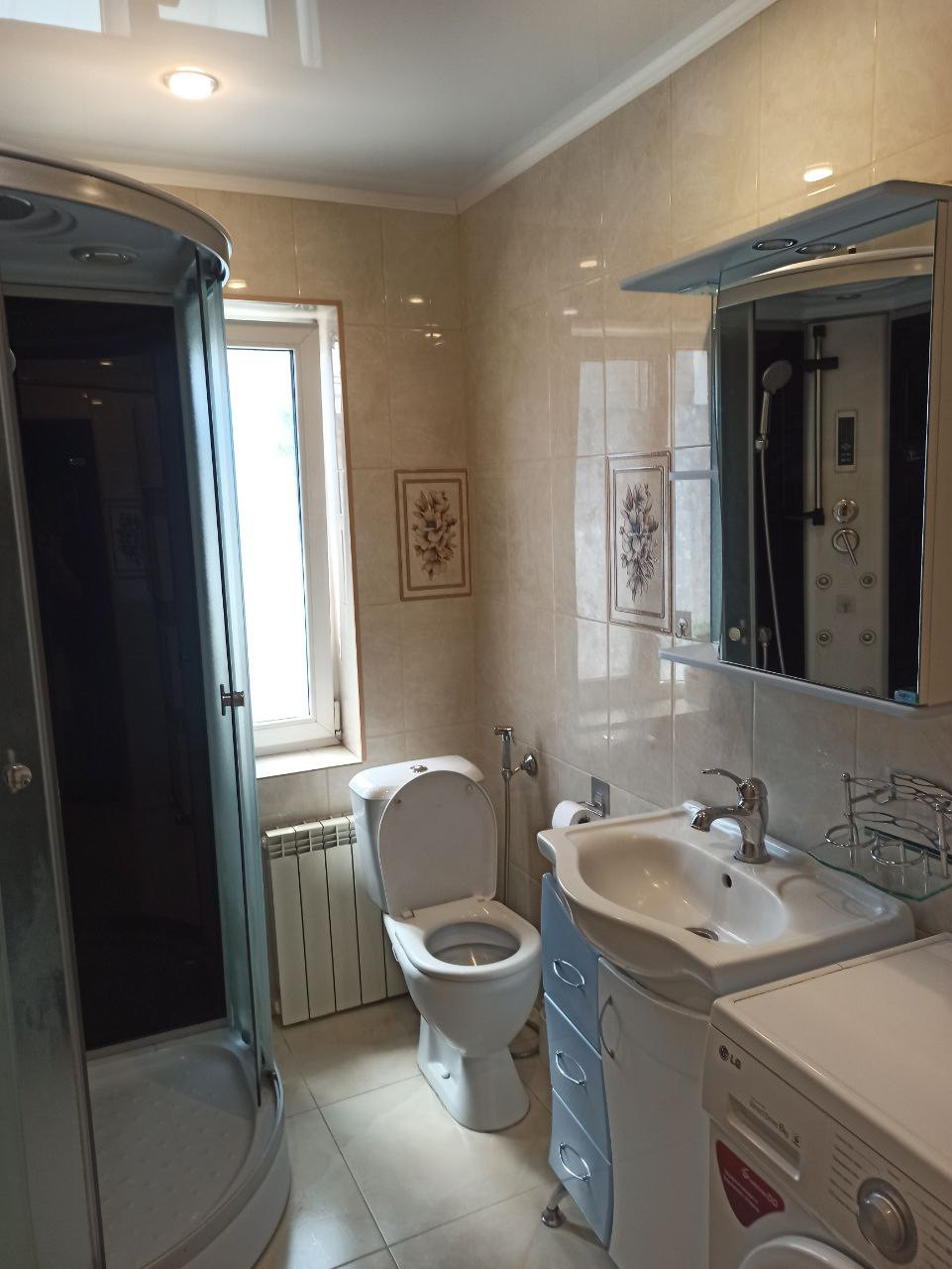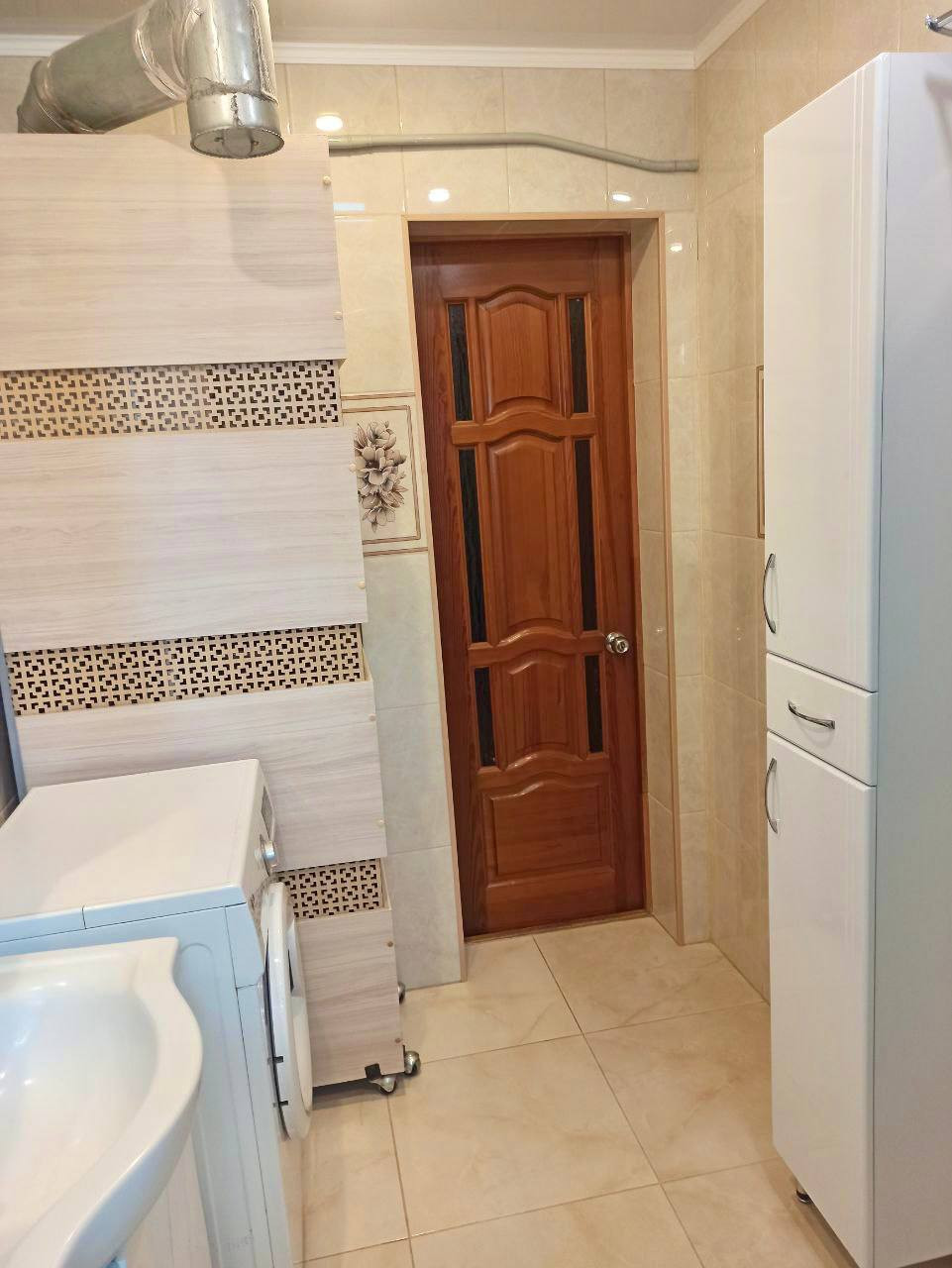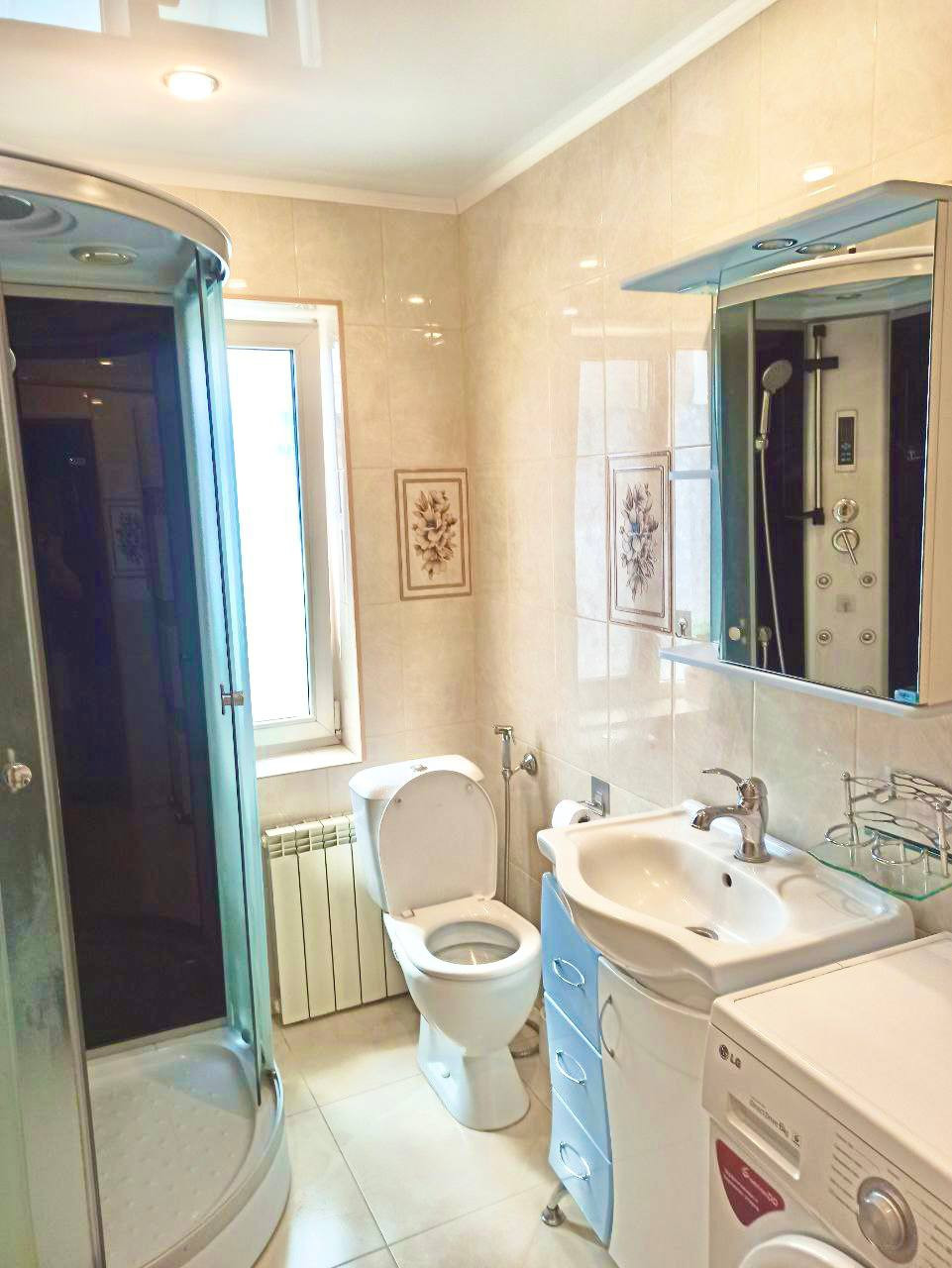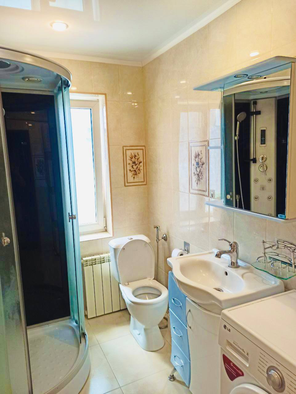 Ванная комната оснащена душевой кабиной, туалетом, гигиеническим душем и умывальником. Просторная кухня оборудована встраиваемой бытовой техникой: посудомоечная машина, варочная поверхность и духовой шкаф, мойка из искусственного камня, а также на кухне имеется подпол для хранения.