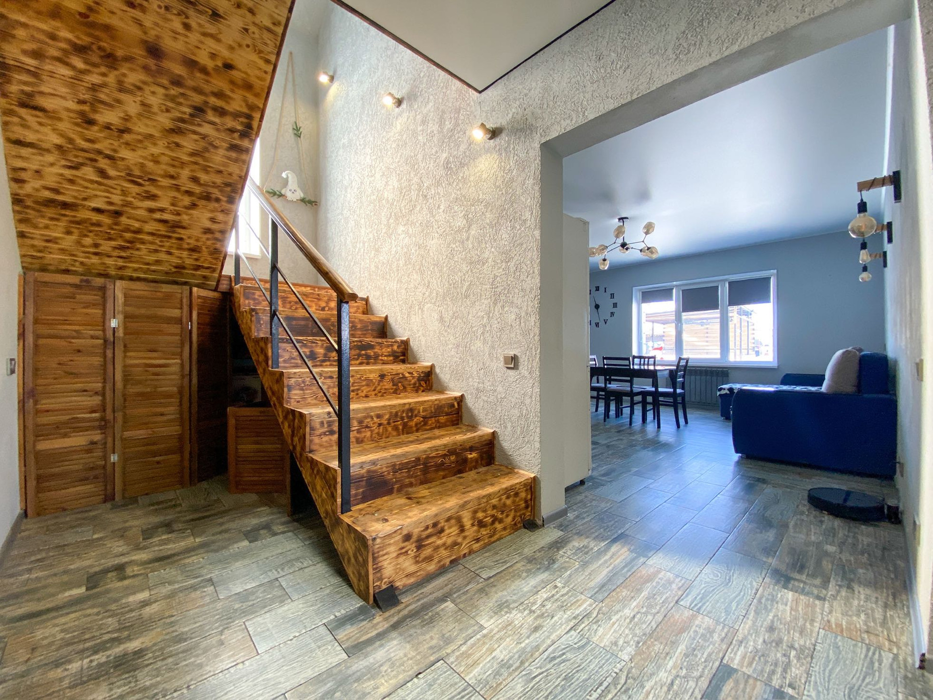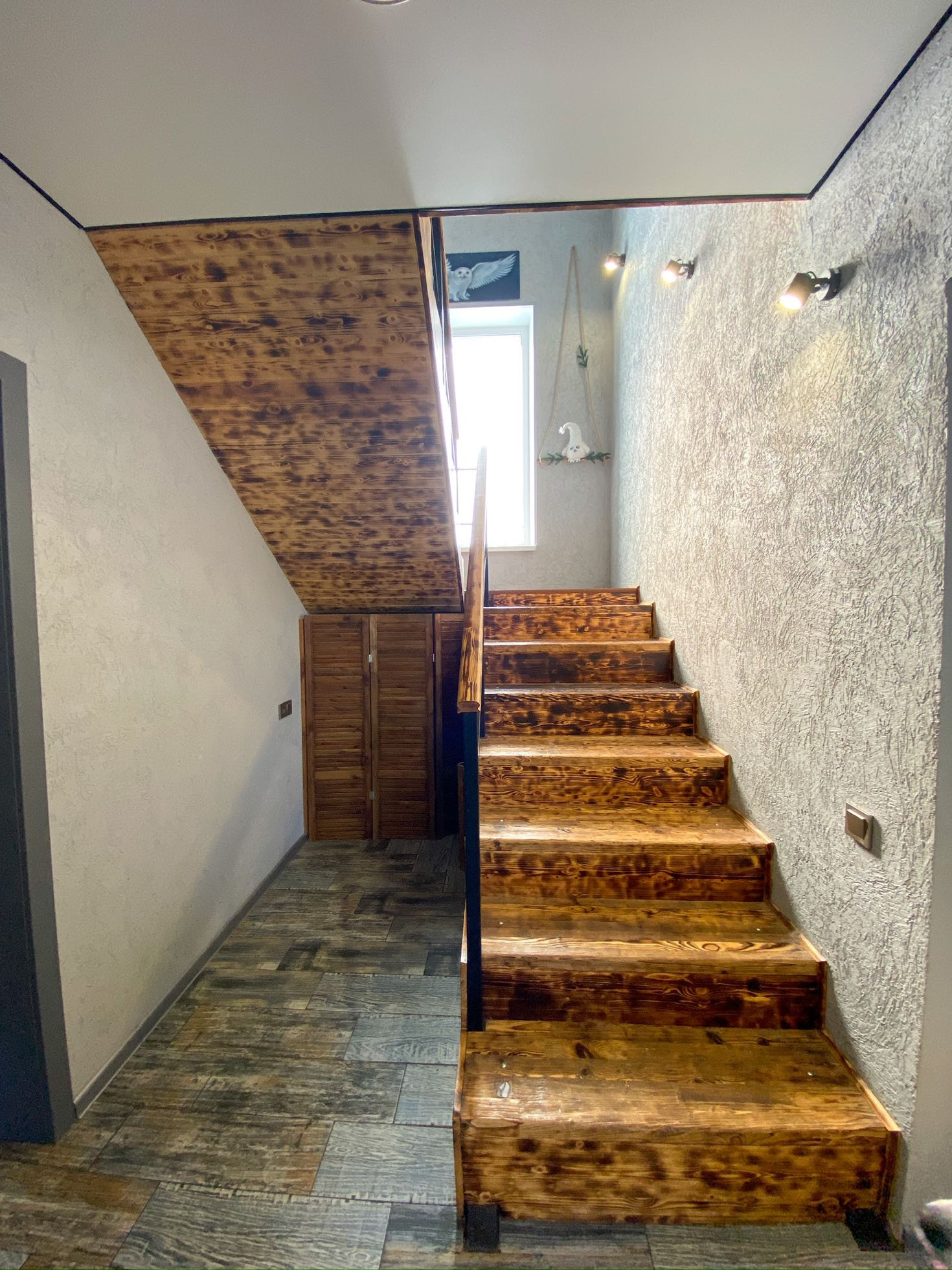 Отдельное внимание уделю лестнице она просто шикарная с эффектом палубной доски, когда вы подымаетесь, как же приятно ногам которые чувствуют каждую выемку дерева