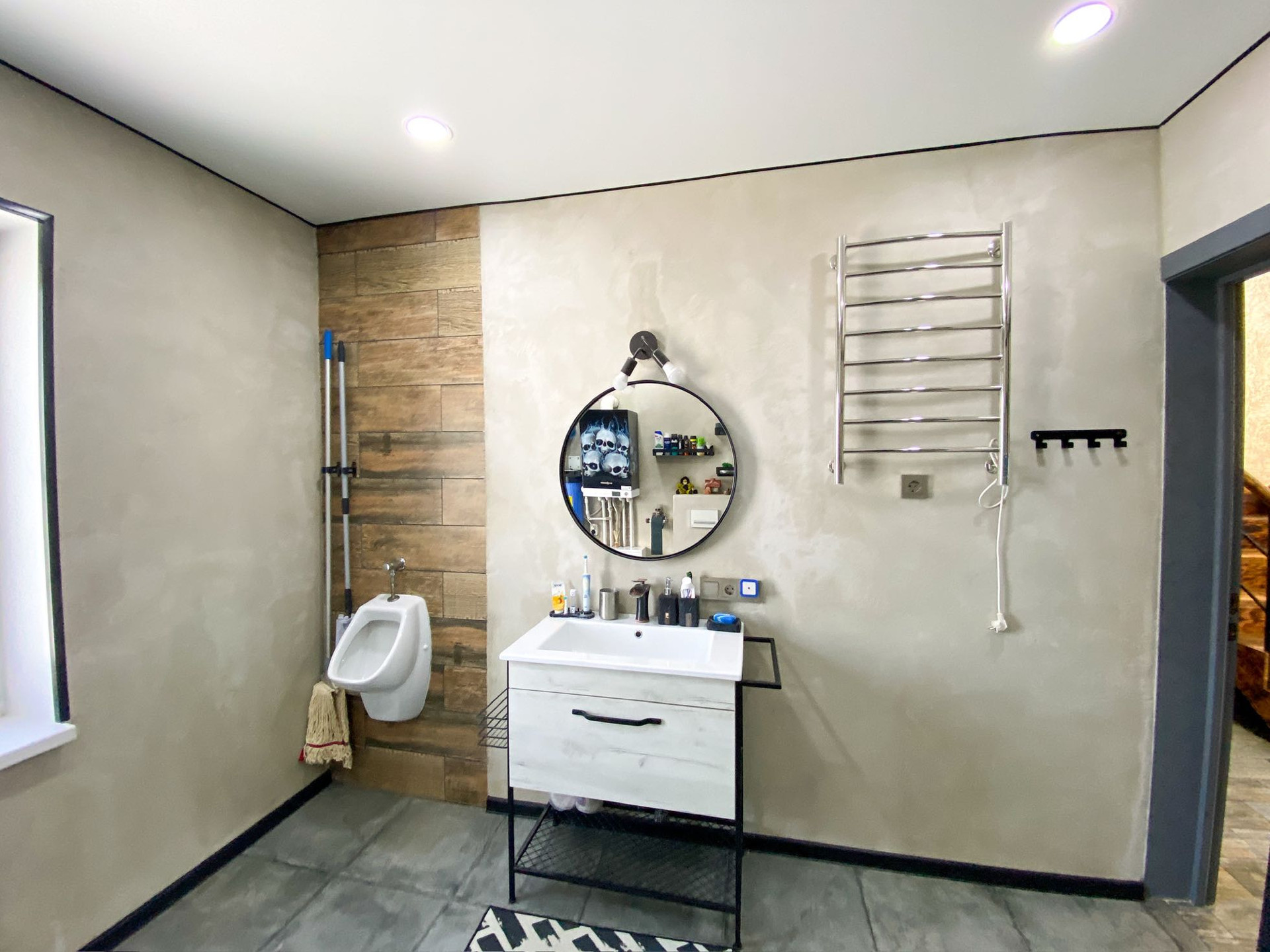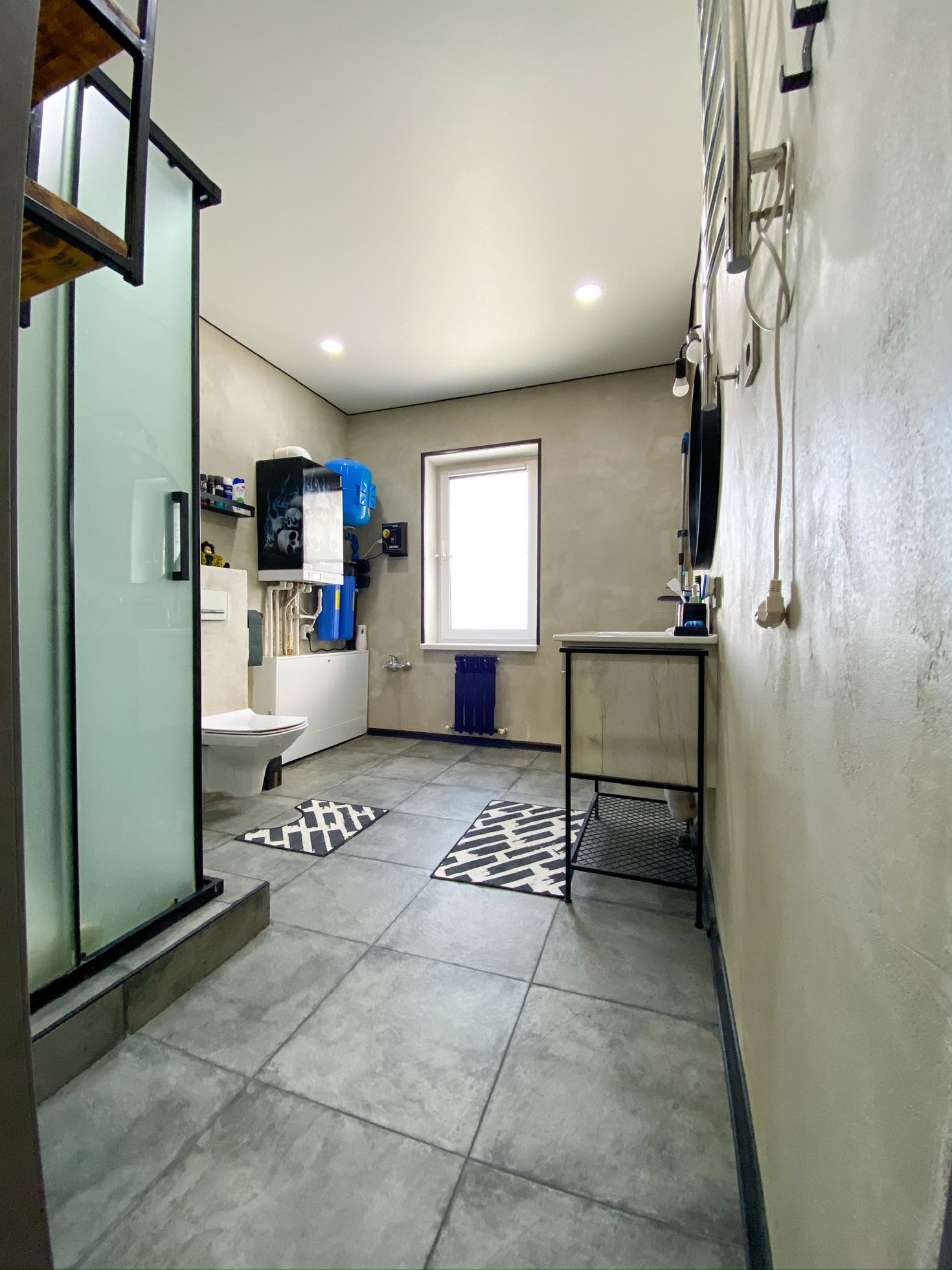Санузел очеееень просторный, с душевой кабиной, инсталляция и писсуар.