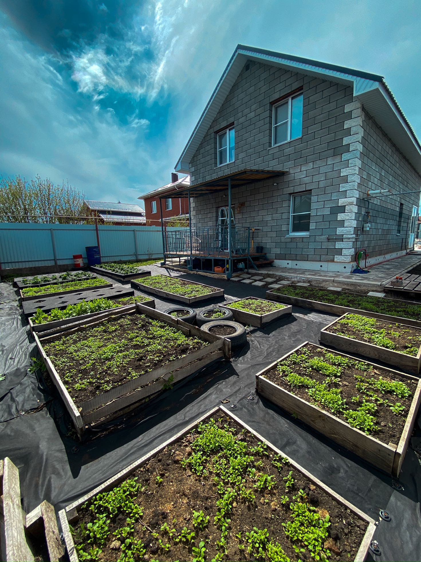 на заднем дворе полностью уложен спанчбоб(что бы не росла трава) готовые грядки, высажена клубника