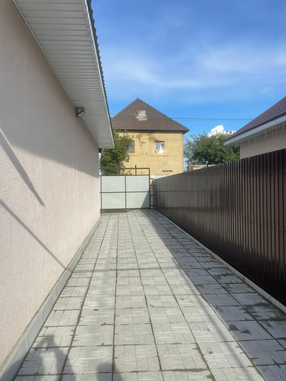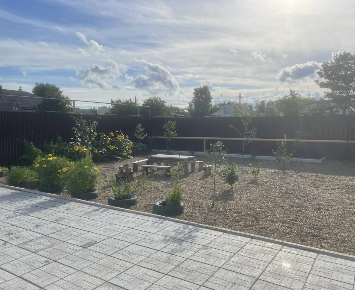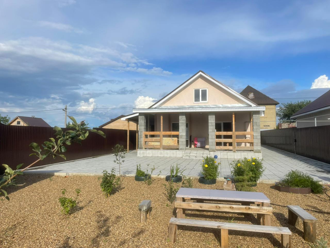 Отдельно стоящий дом 74.5 кв м на 5.5 сотках земли, с хорошим ремонтом и полностью благоустроенной территорией, с выходом на большую террассу, отмостка по периметру, двор замощен плиткой, с тротуарным водостоком, участок огорожен забором с проф листа. В доме выполнен качественный ремонт, две спальни и гостиная, кухня 10 кв м. Есть мансардный этаж.