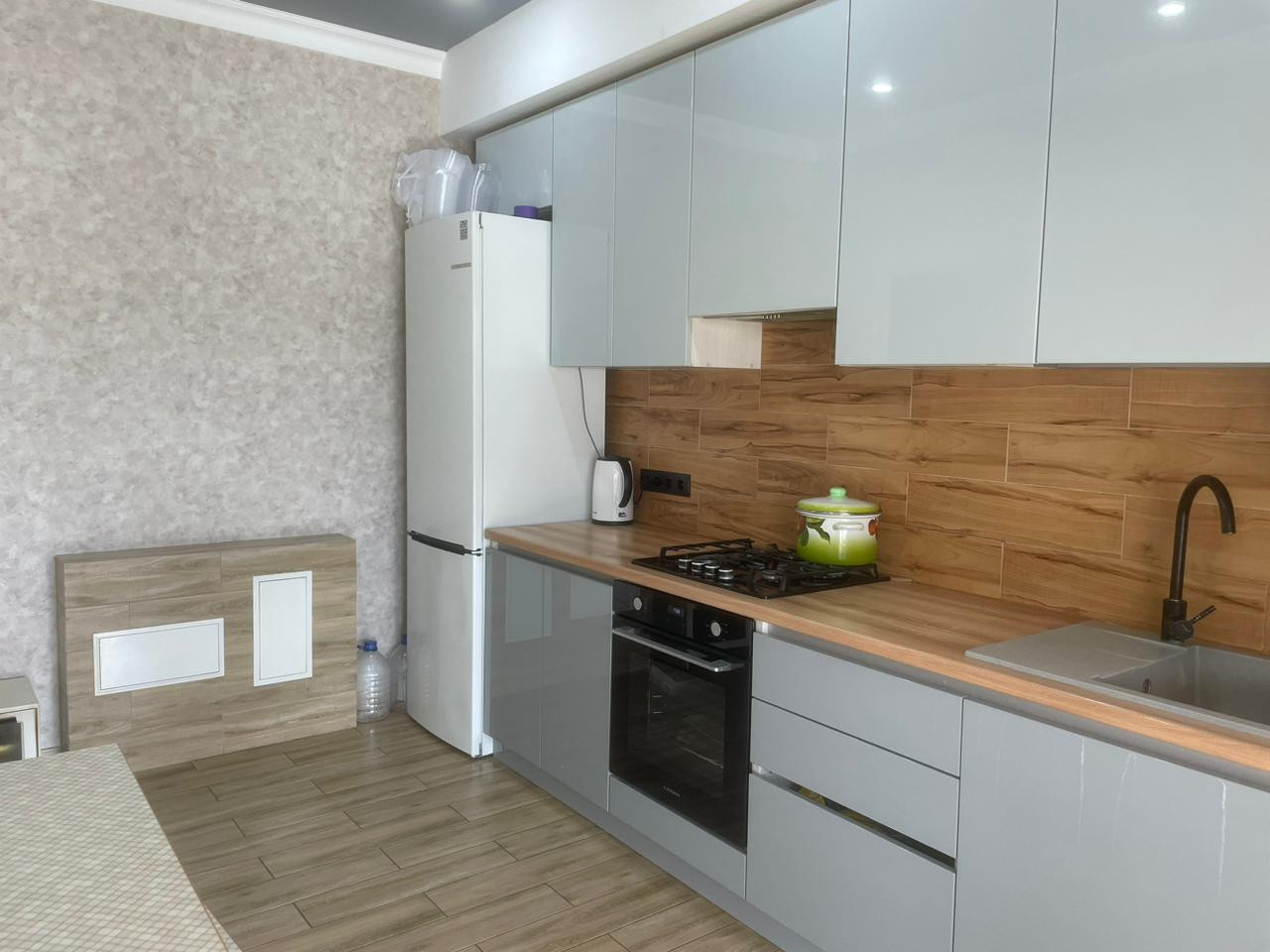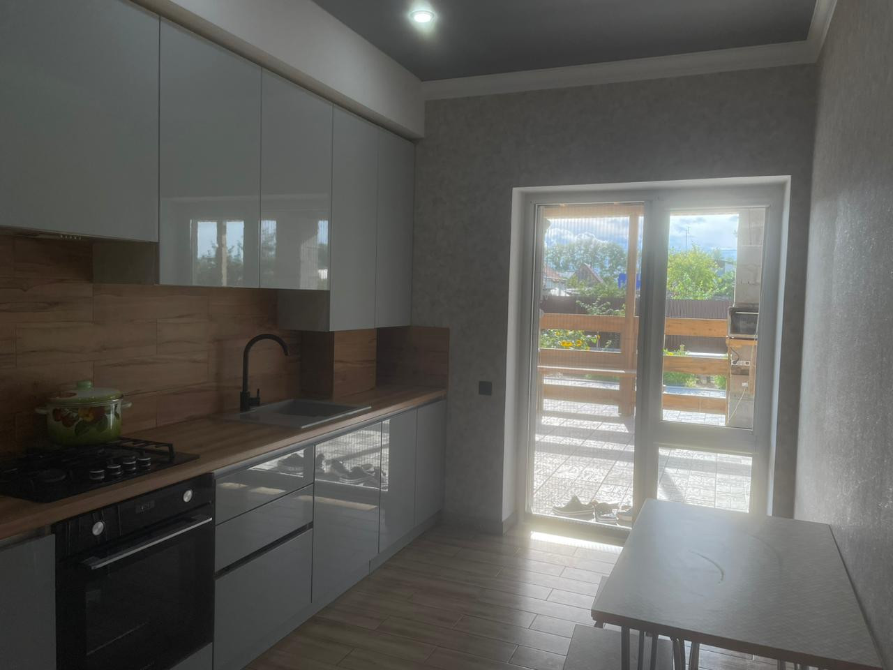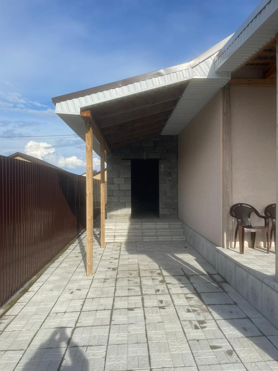 Отдельно стоящий дом 74.5 кв м на 5.5 сотках земли, с хорошим ремонтом и полностью благоустроенной территорией, с выходом на большую террассу, отмостка по периметру, двор замощен плиткой, с тротуарным водостоком, участок огорожен забором с проф листа. В доме выполнен качественный ремонт, две спальни и гостиная, кухня 10 кв м. Есть мансардный этаж.