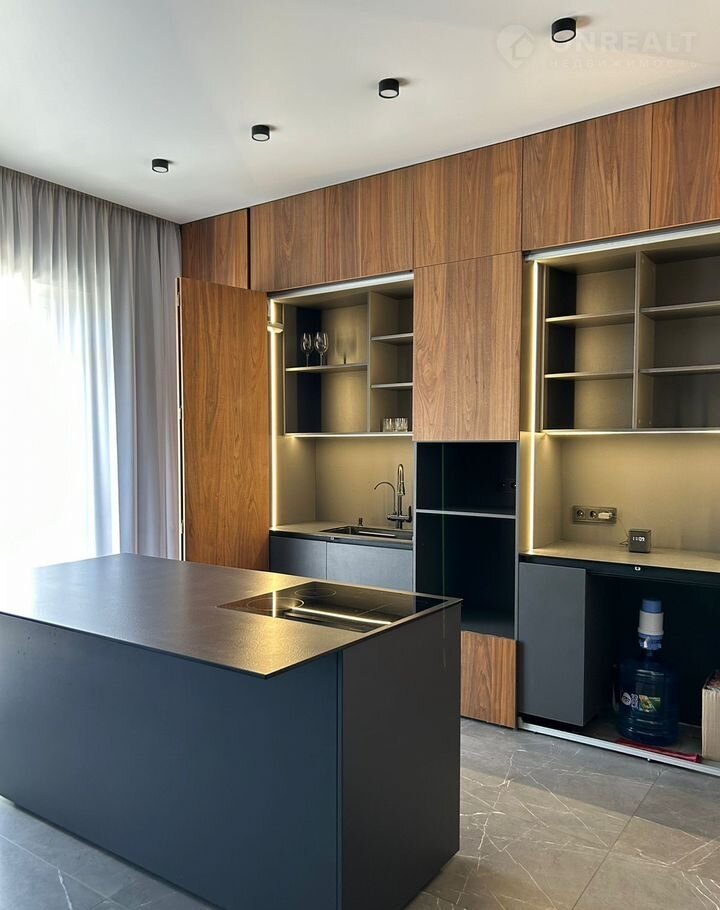 Первый этаж: полностью оборудован для жизни. Большая кухня-гостиная со встроенным кухонным гарнитуром скрытого монтажа, вся «грязная» зона закрыта фасадами из натурального шпона. Есть встраиваемый холодильник и большой остров с варочной панелью, установленной заподлицо на современной столешнице hрl. Кондиционер уютно разместился внутри верхнего шкафа, не нарушая общего стиля кухни. Универсальная комната, которую можно обустроить как детскую или как рабочий кабинет. Просторный коридор с котельной, где установлен двухконтурный котёл Вахi.
