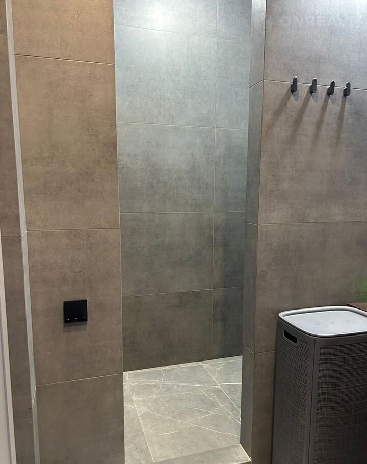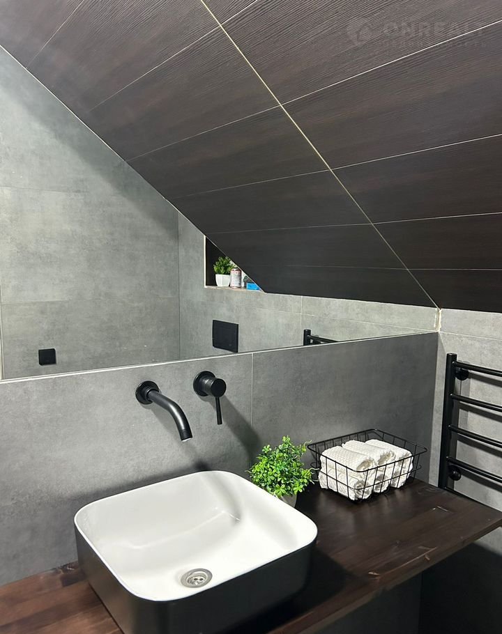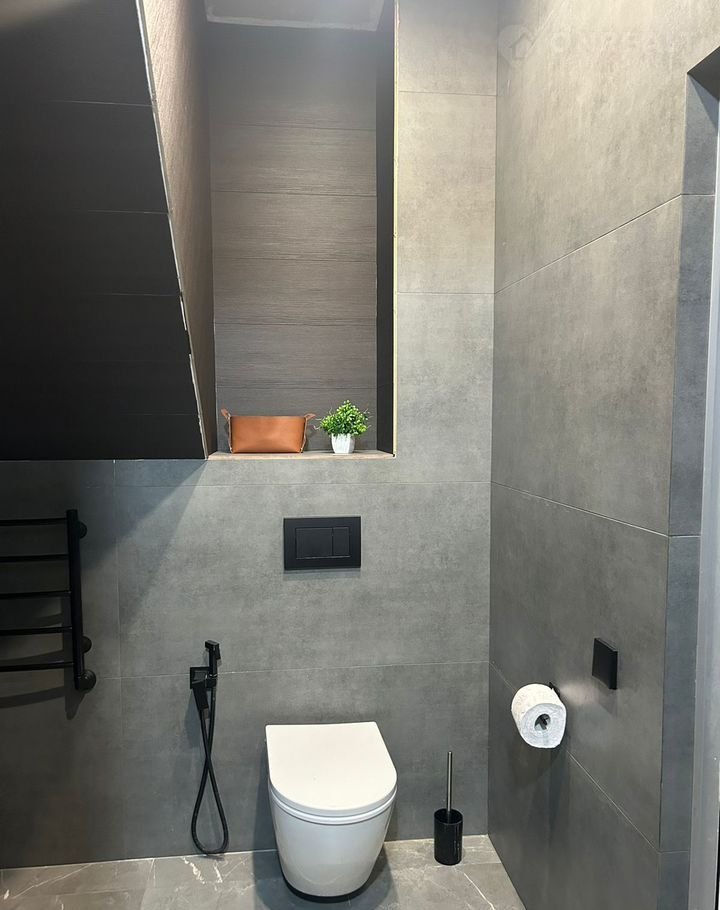 Санузел оснащен просторной душевой зоной, зеркалом и стильной накладной раковиной. Установлена инсталляция с подвесным унитазом, который добавляет современности и легкости в интерьер. Дом оснащён качественной разводкой для системы «умный дом», установлены выключатели Zigbее. Также имеется мастер-клавиша, которая позволяет отключить весь свет в доме при выходе. При желании можно установить подсветку в плинтусы для создания эффекта парящих стен.
