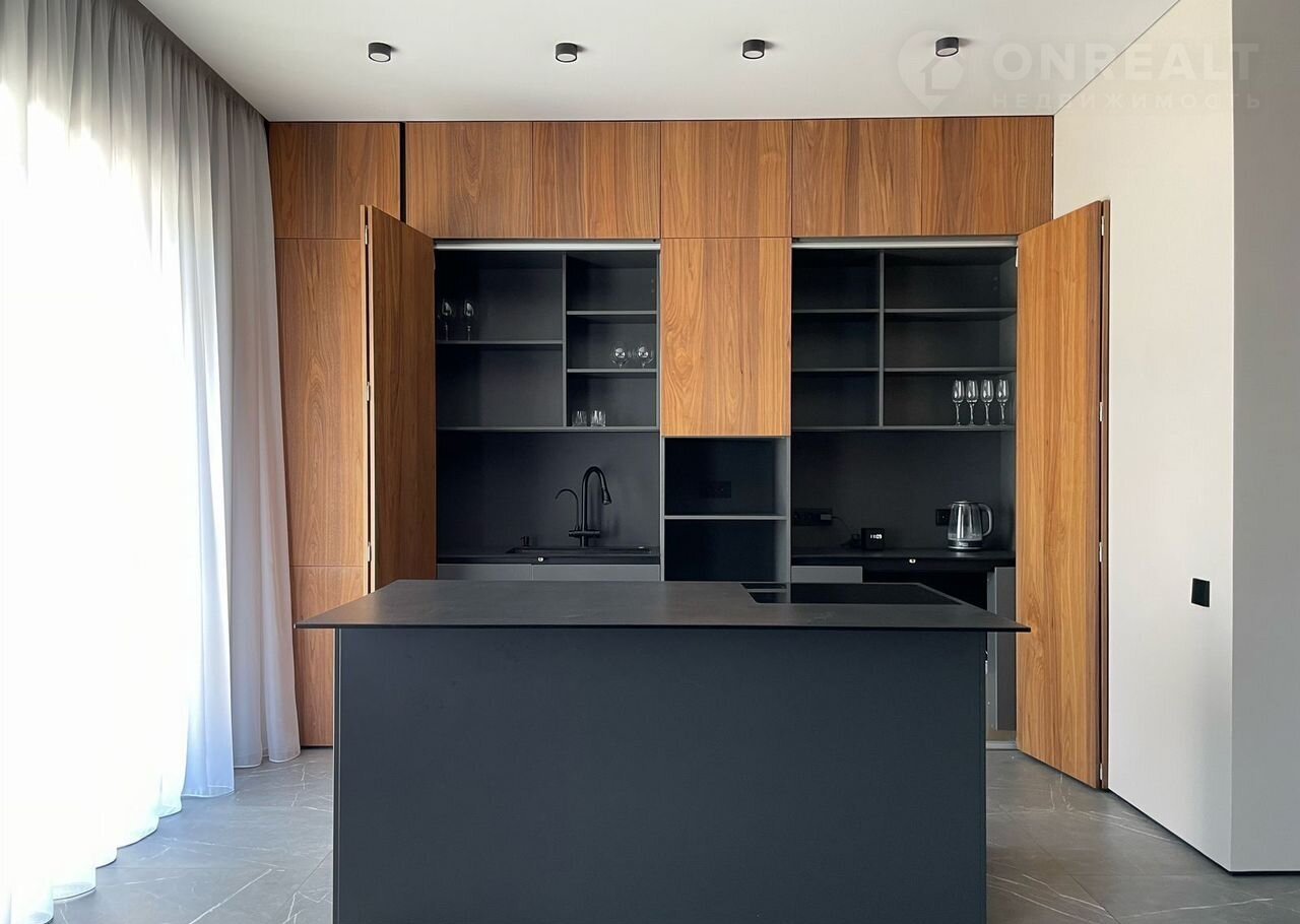 В стоимость дома входит не только кухонный гарнитур с техникой, но и обеденная зона (стол и стулья), подвесная тумба, диван, шторы.