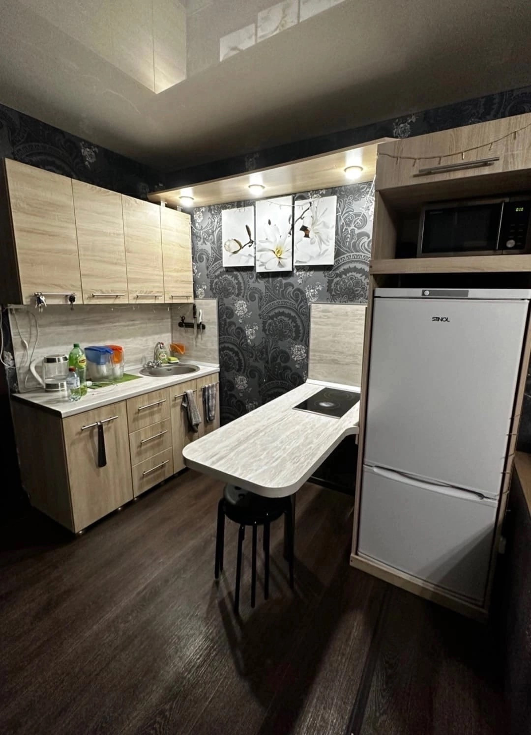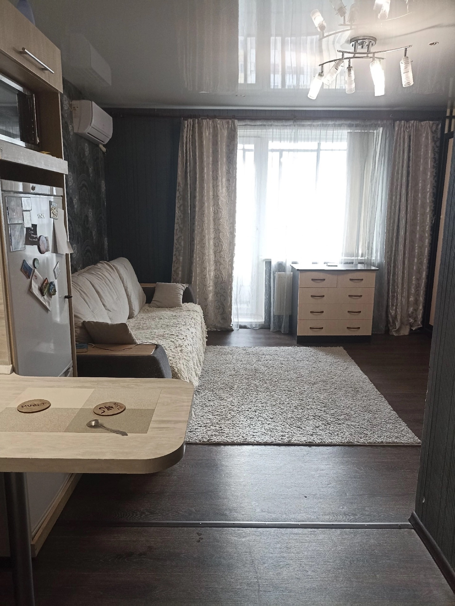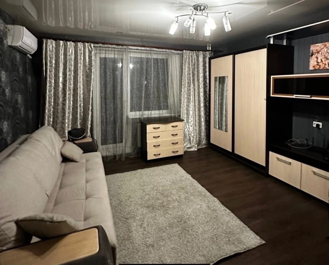 Все мебель и техника остается: микроволновка, чайник, варочная поверхность в барной стойке, стулья, стиральная машина, кондиционер, кухонный гарнитур, диван, стенка со шкафом купе, комод, столик