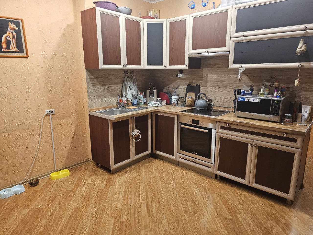 Остаётся вся необходимая для проживания техника и мебель: встроенная техника Bosch (варочная панель, духовой шкаф, холодильник); кровать, матрац; обеденный стол; водогрейка и т.д.