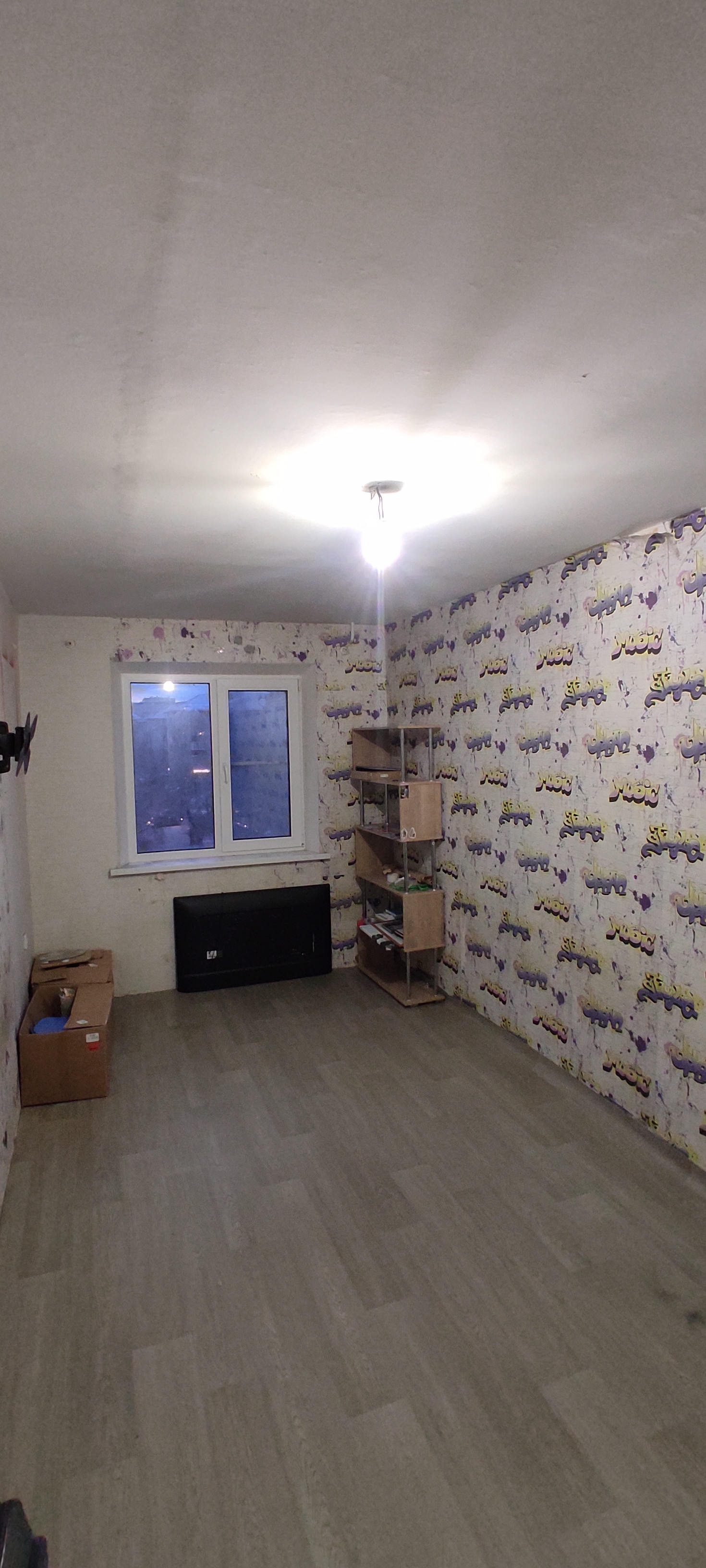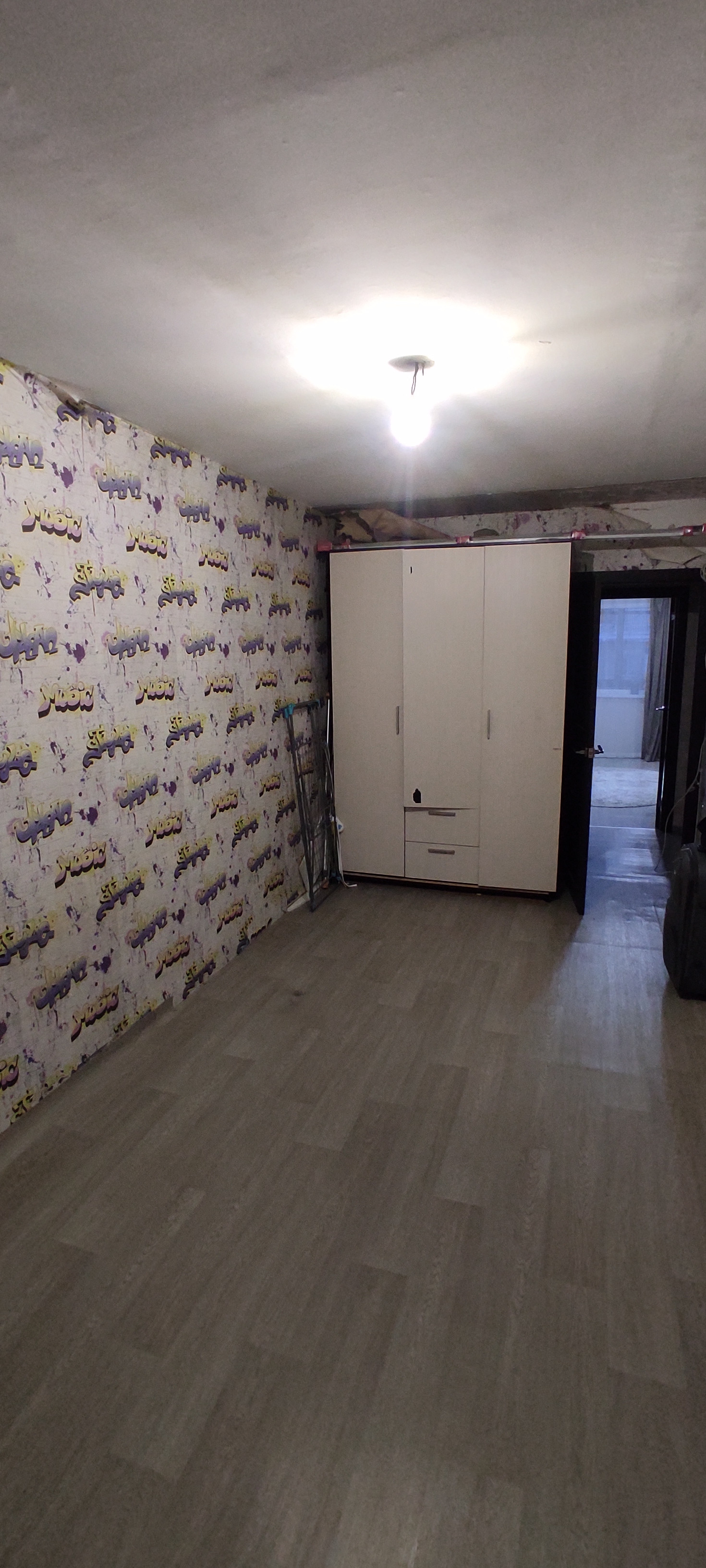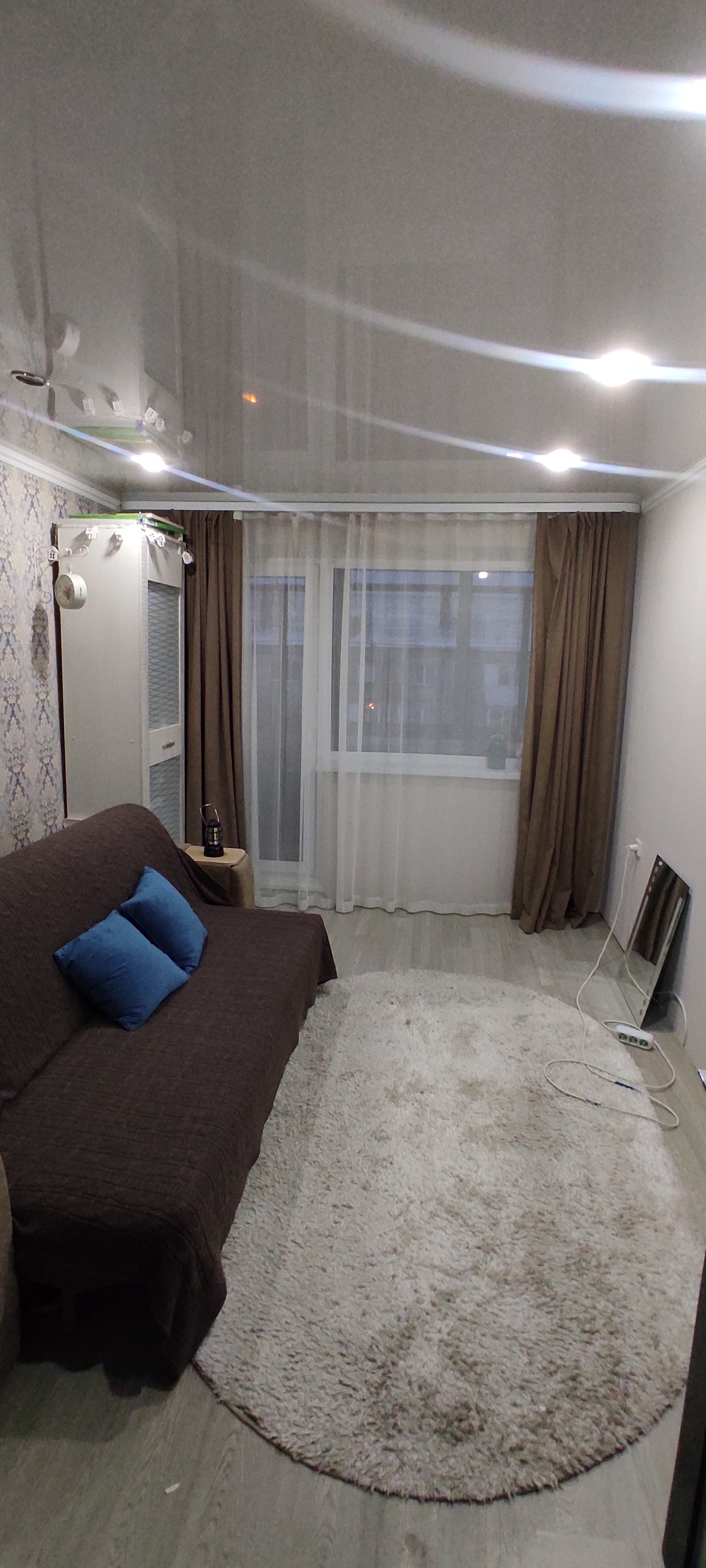 Квартира в хорошем жилом состоянии. Окна пластиковые, потолки натяжные, заменены межкомнатные и входная двери, на полу линолеум. Есть вместительная кладовка. Санузел совмещён, подготовлен к ремонту, трубы поменяны на пластик. Спальня в обычном состоянии, остаётся шкаф.