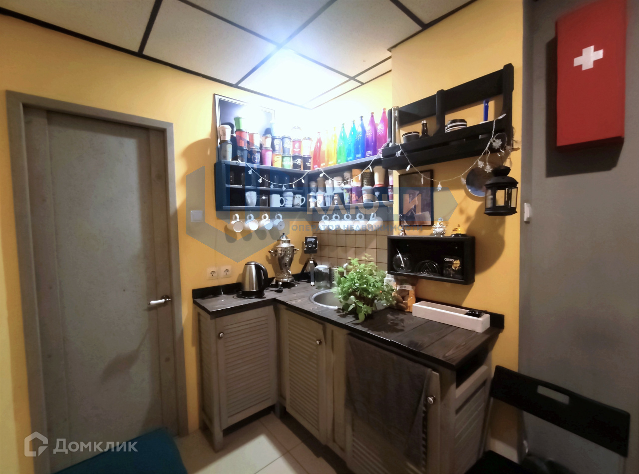 Все коммуникации центральные, выведены радиаторы отопления. Окна пластиковые с решетками. Стены выровнены под покраску, напольное покрытие комбинированное (керамическая плитка + дерево).Помещение имеет отличную планировку, благодаря которой можно воплотить свои идеи для бизнеса: сервисный центр, мастерская, студия для творчества / фотостудия, офис заказов, ателье и т.д. Планировка включает в себя: 2 сан.узла + душевая; 2 кухонные зоны; кабинет; остальные помещения свободного назначения.