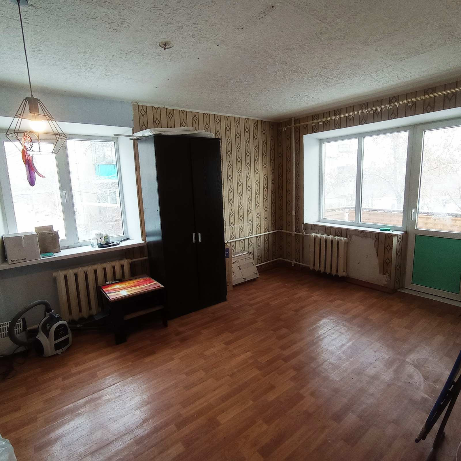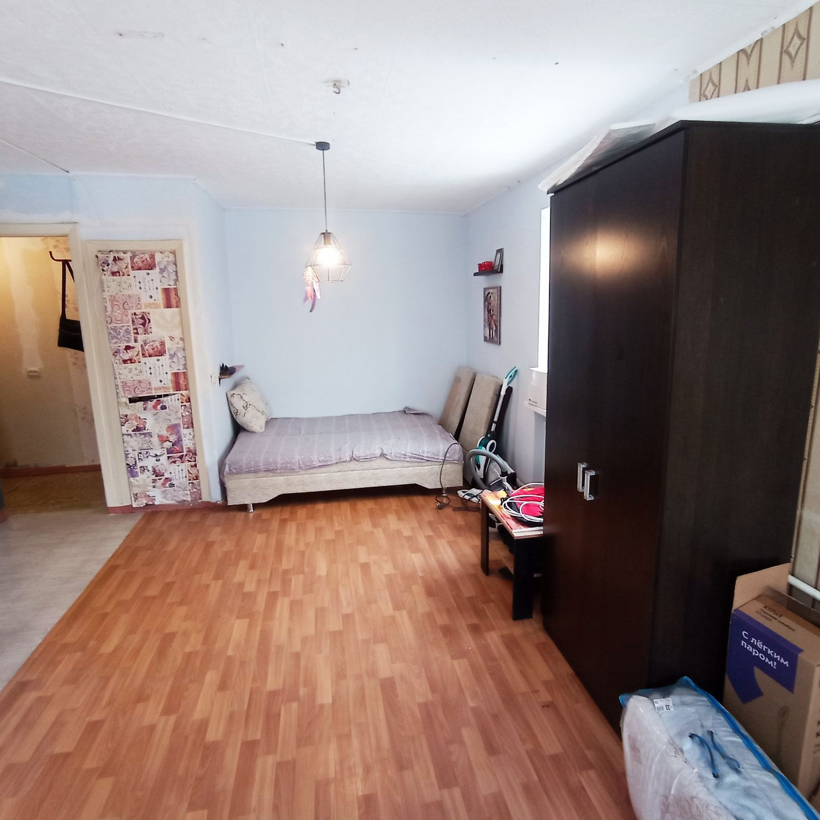 В квартире имеется: диван, шкаф, кухонный гарнитур, пылесос.