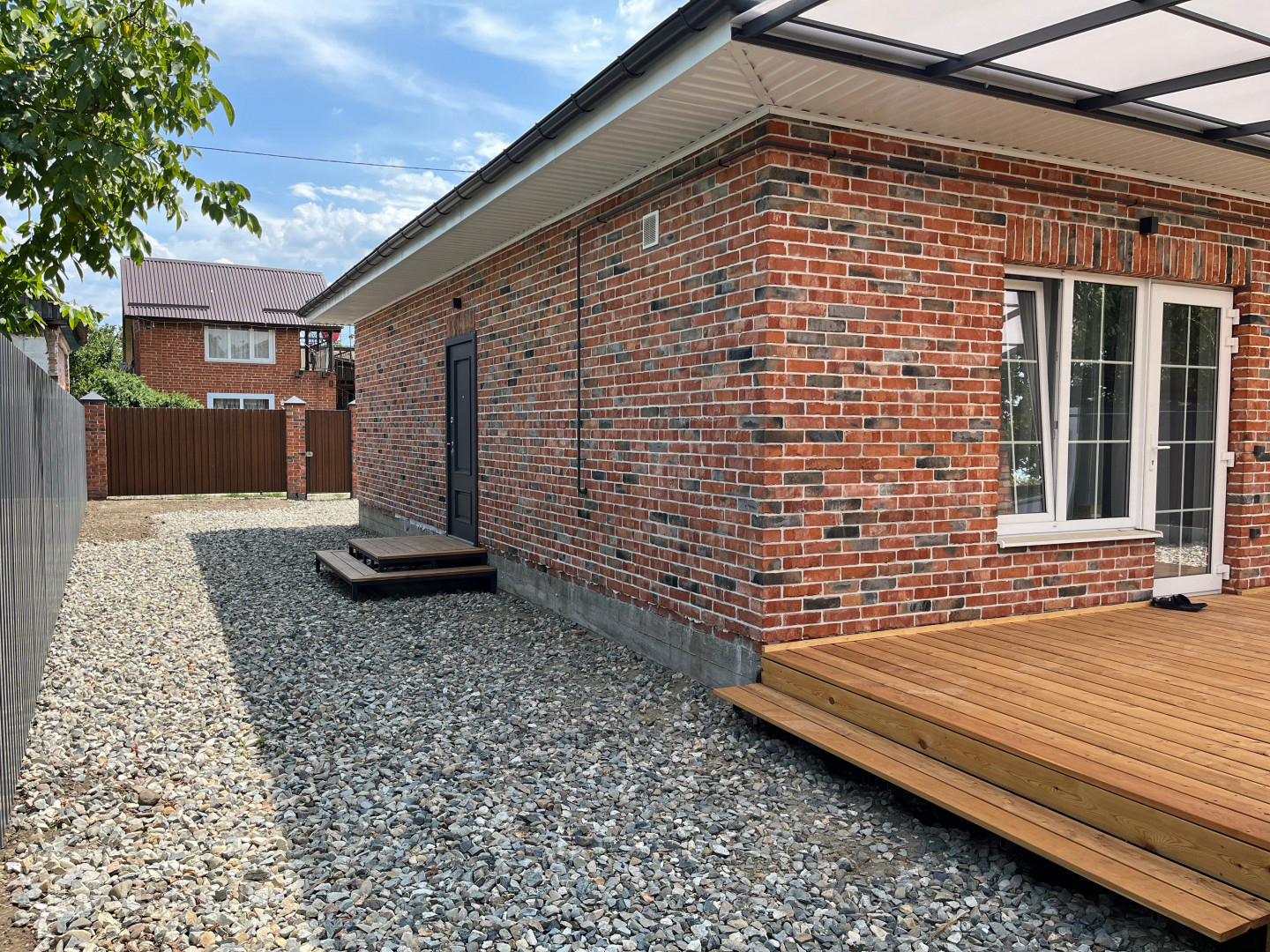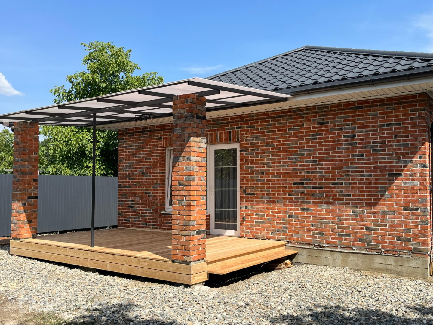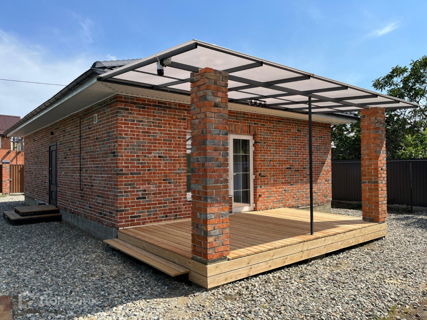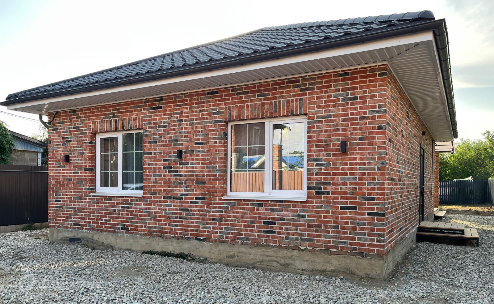 Дом выполнен из красного кирпича, с белым швом. Крыша из металлочерепицы, с матовым графитовым покрытием.