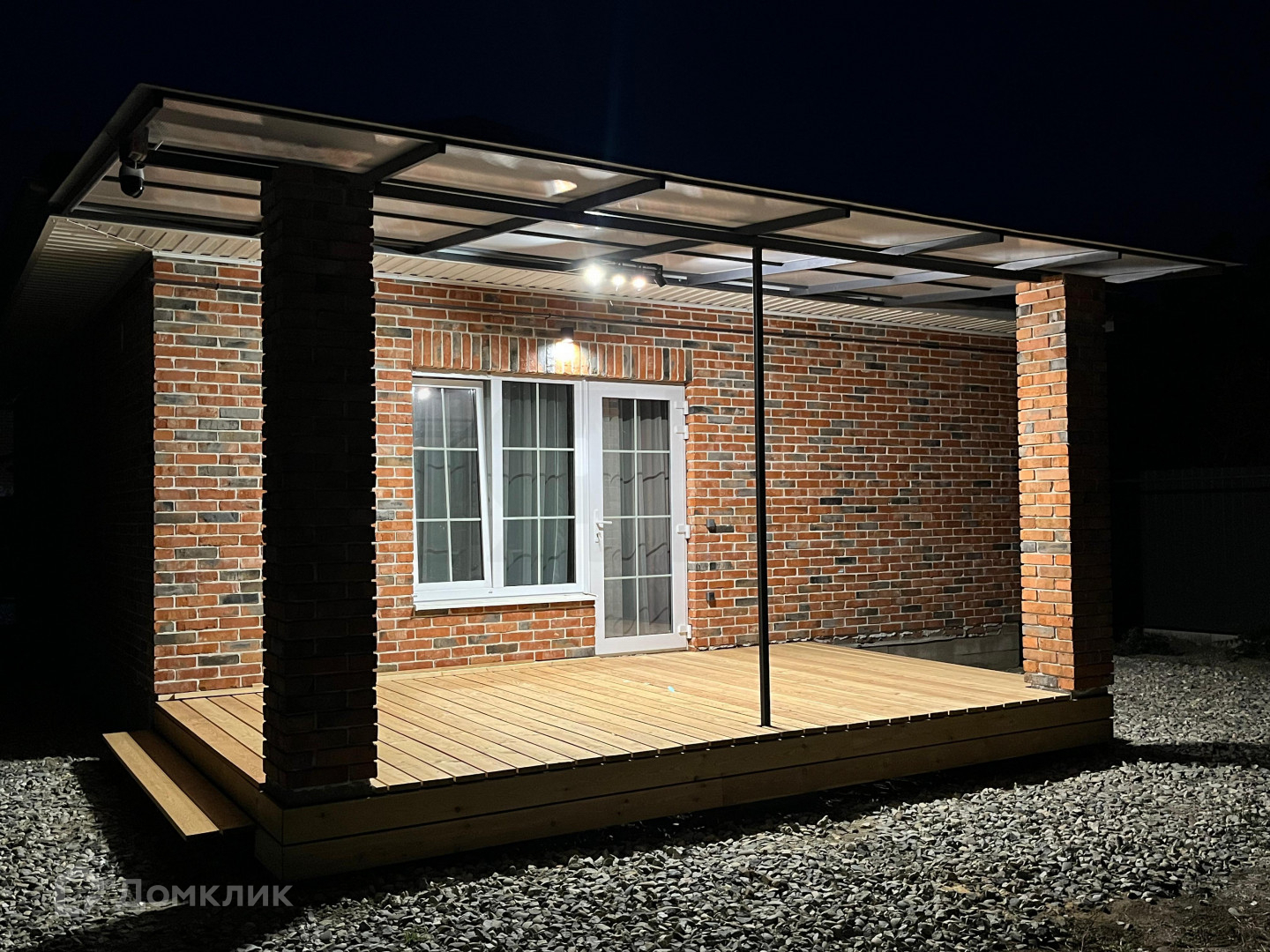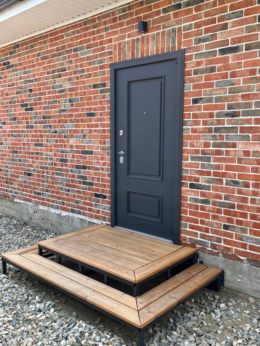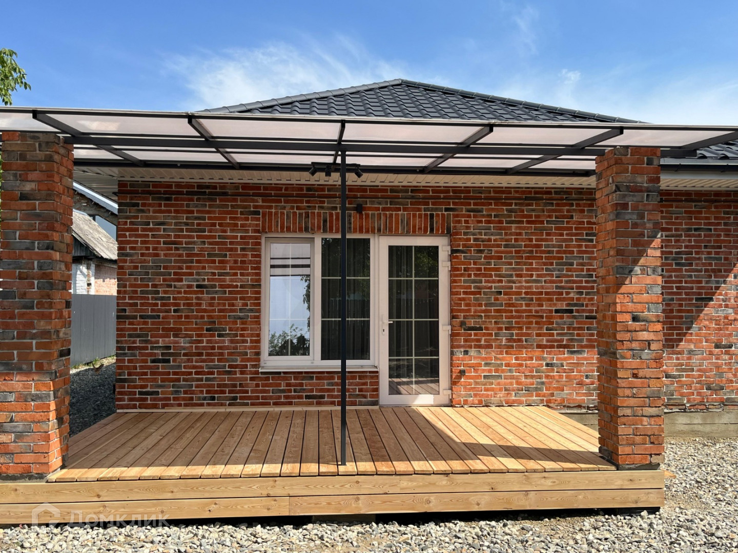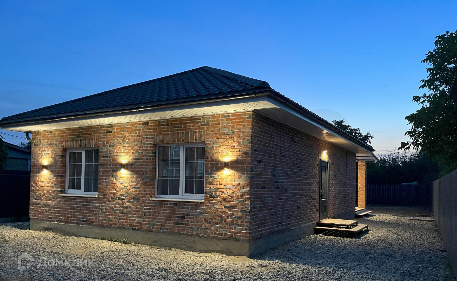 Дом выполнен из красного кирпича, с белым швом. Крыша из металлочерепицы, с матовым графитовым покрытием.