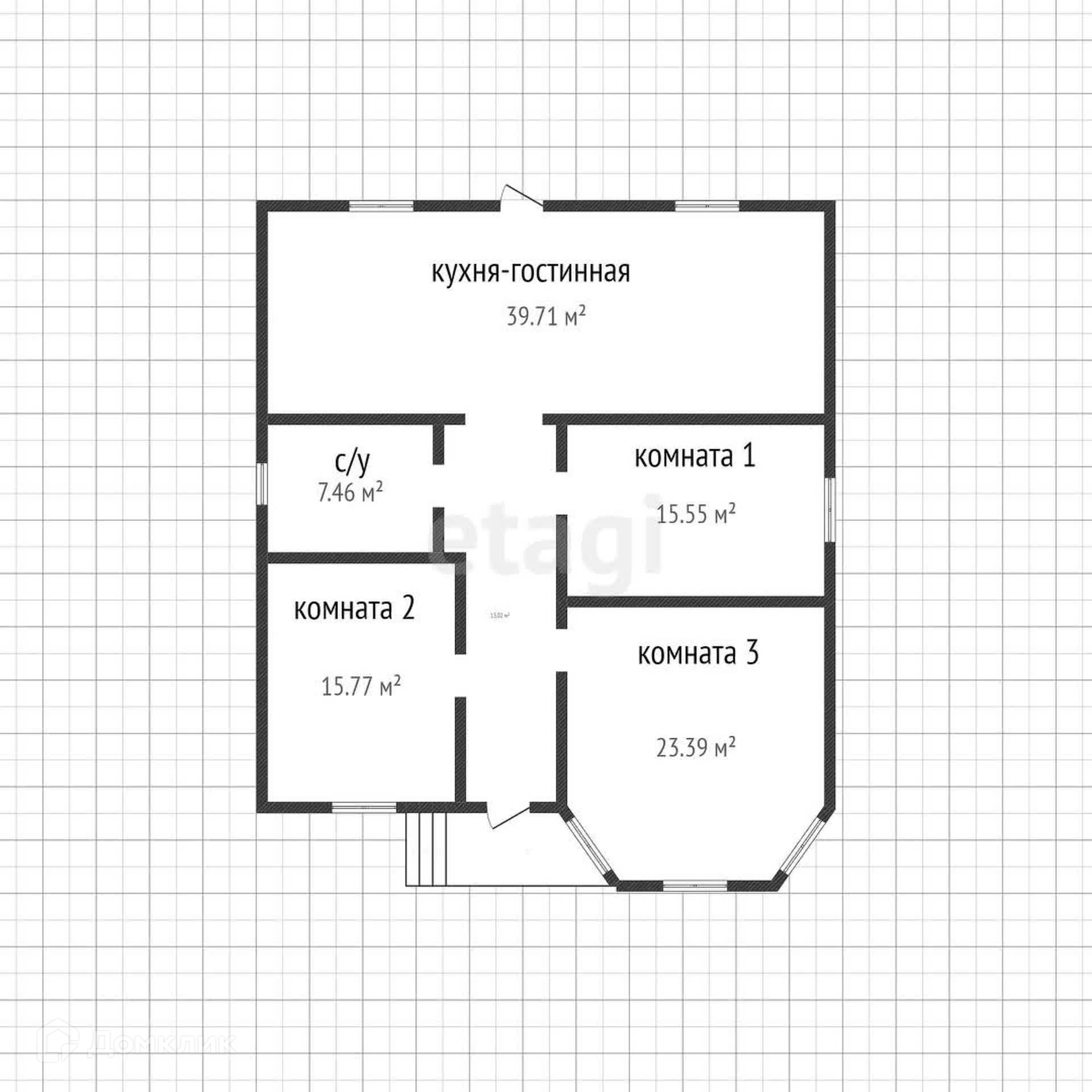 Дом состоит из трех жилых комнат и большой кухни-гостинной площадью 40 м2.