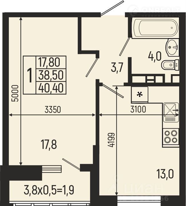 Общая площадь 40.4 м2