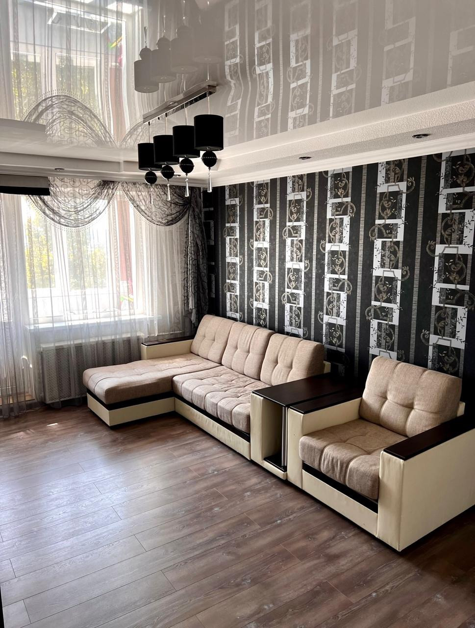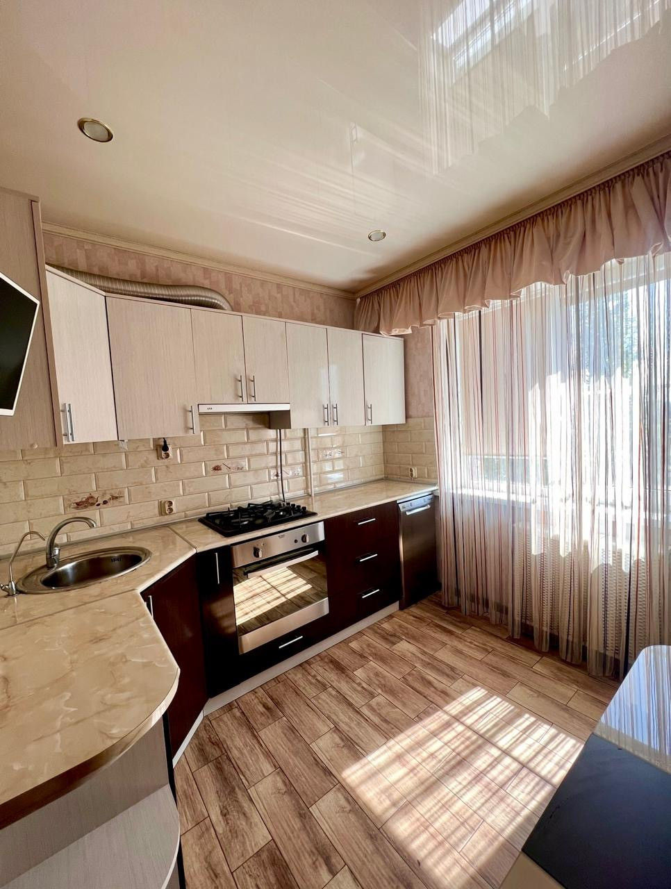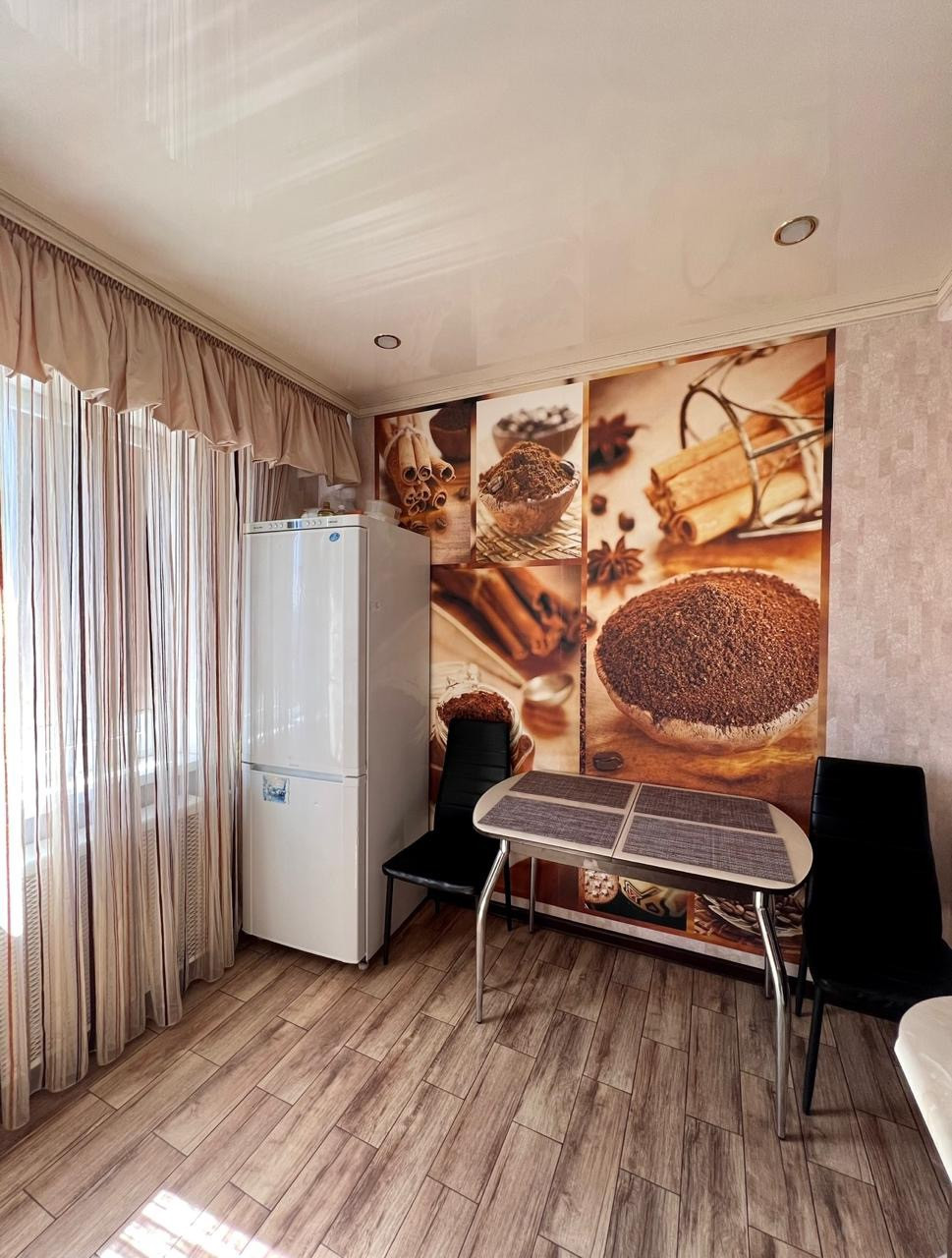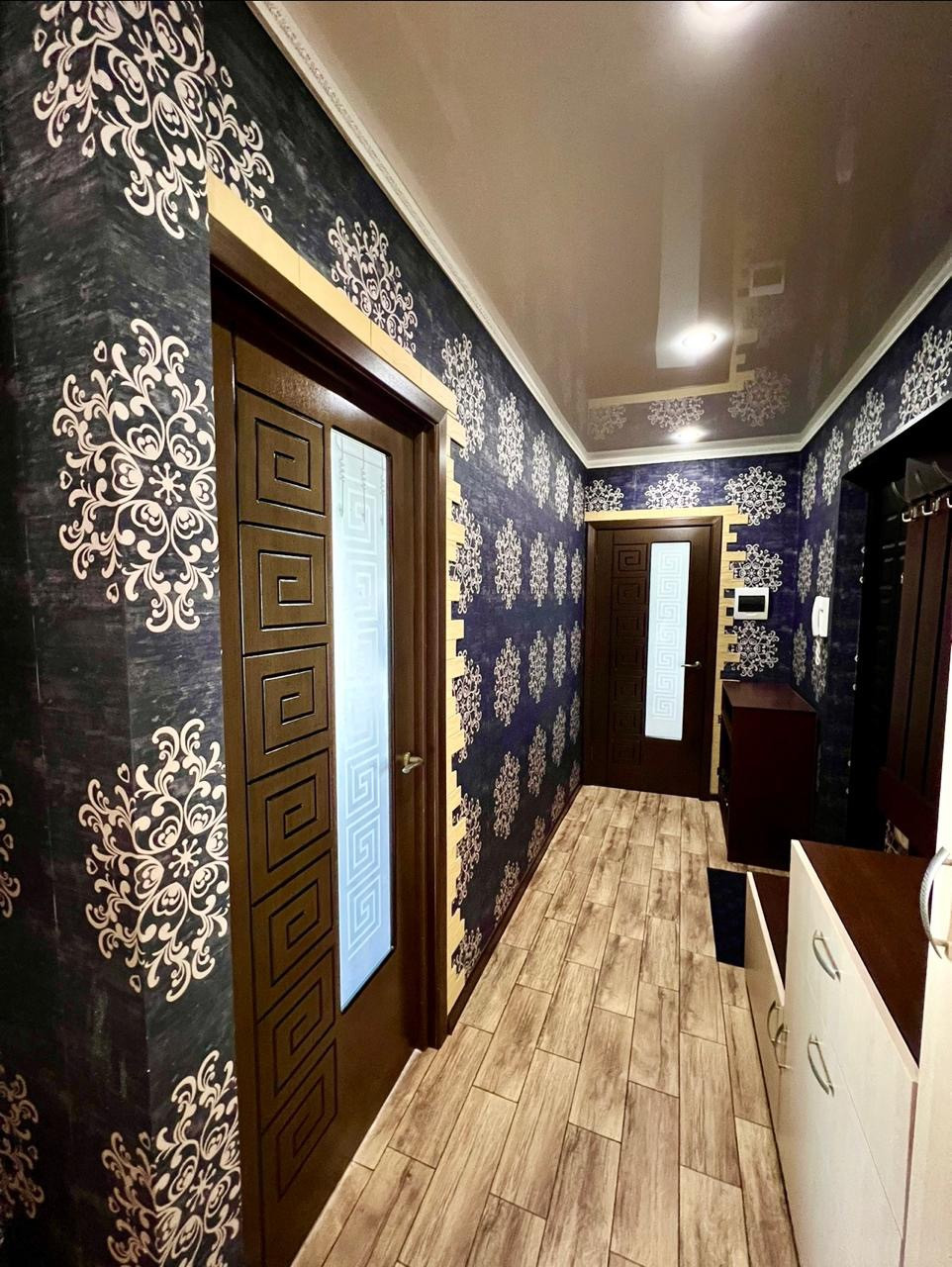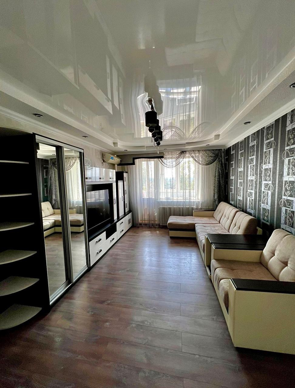 Во всех комнатах натяжной потолок, постелен ламинат, в коридоре и кухне матовая, нескользящая плитка. Обои итальянские, в спальне с 3D эффектом. На кухне фартук из плитки.