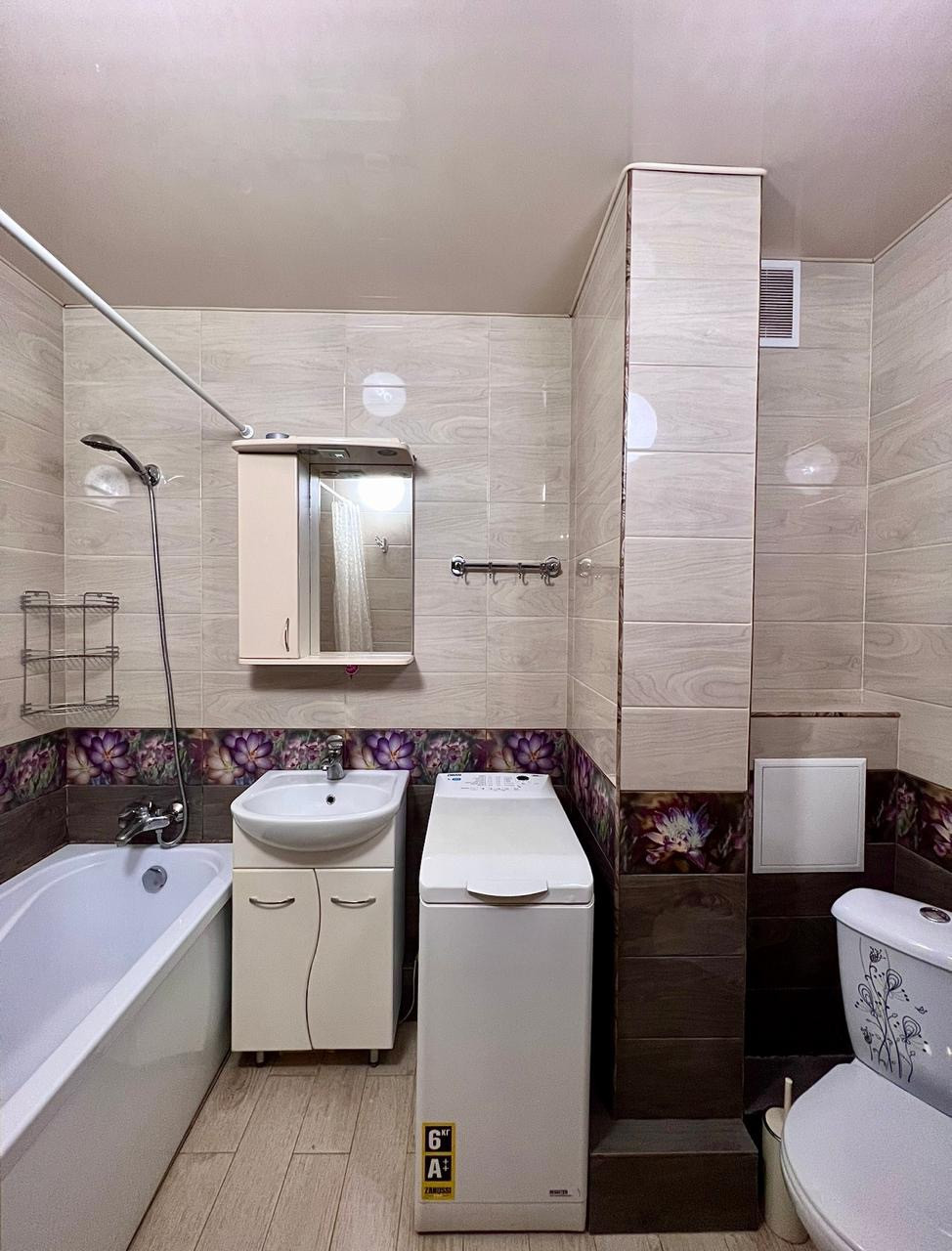 Ванна: зеркало с шкафчиком, полотенцесушитель, стиральная машина Zanussi.