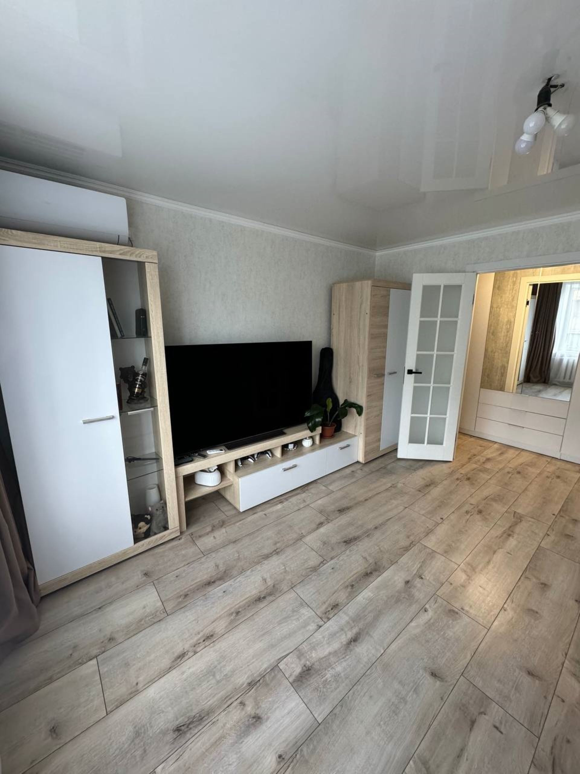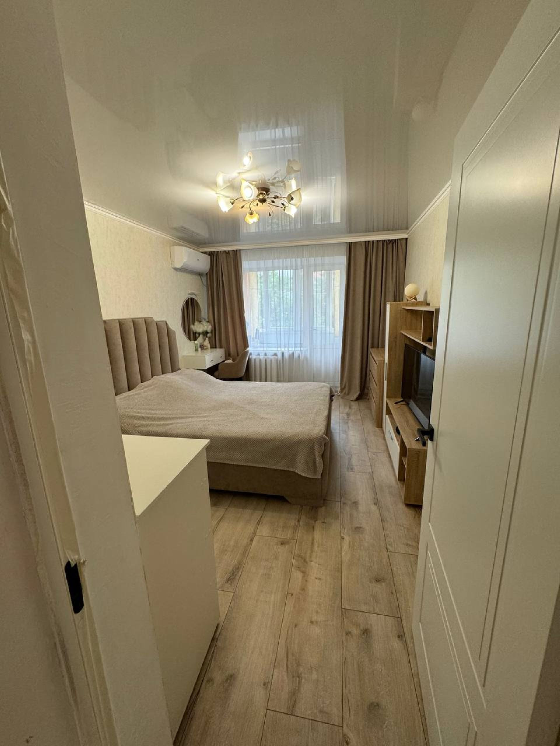 Пол ламинат, металопластиковые окна во всей квартире, раздельный санузел, натяжные потолки, сплит-системы Наirе в спальне и гостинной.