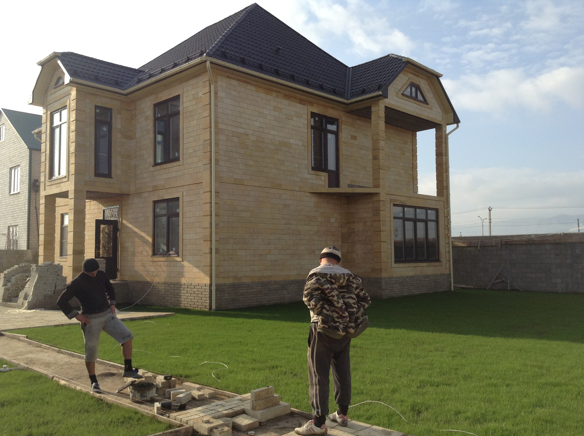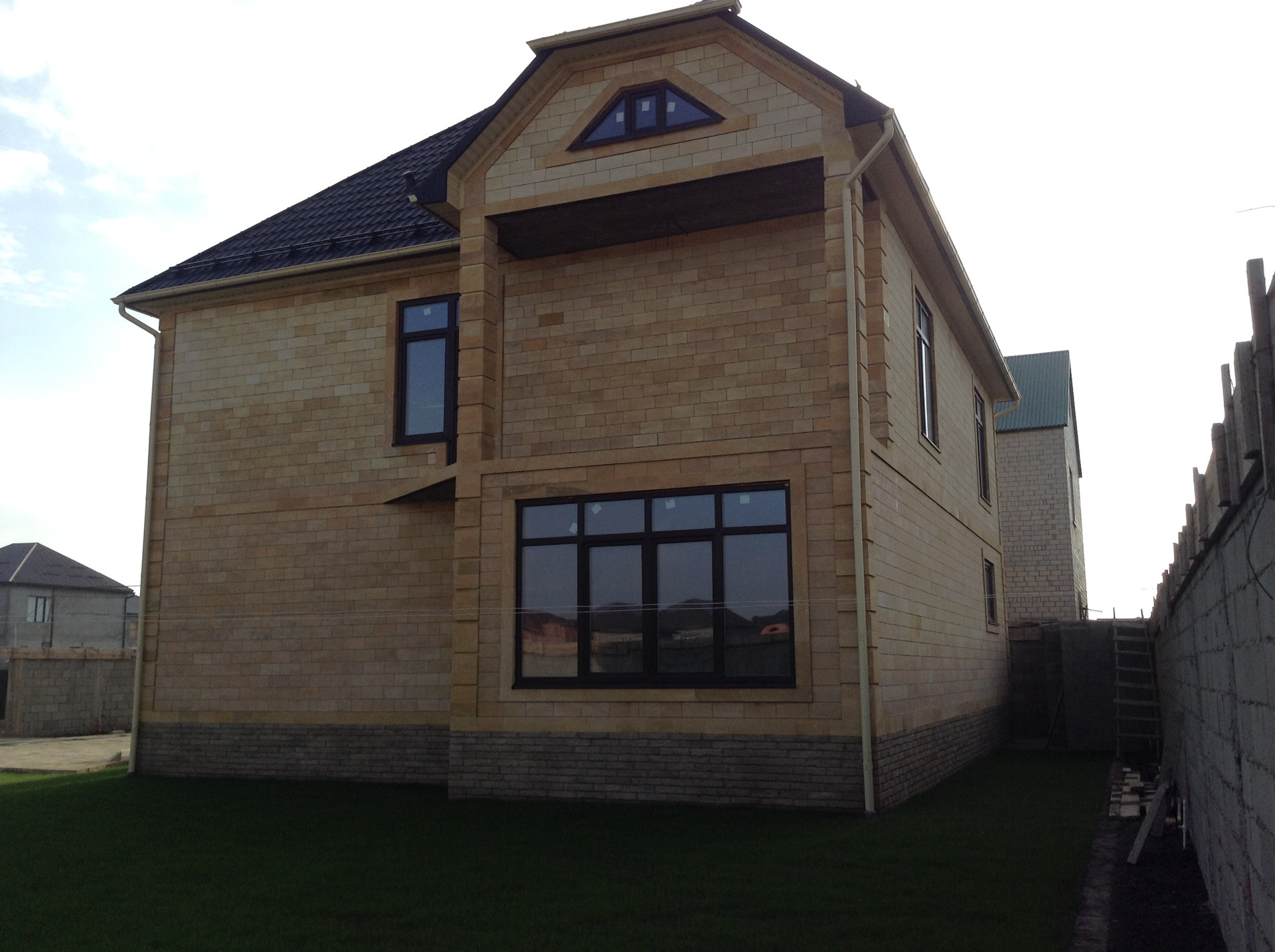 Дом по периметру облицован Дагестанским камнем, двор также уложен этим же камнем. Установлены бесшумные, звукоизоляционные, энергосберегающие окна REHAU INTELIO c толщиной профиля 86 см.Для перекрытия использовалась  финская метало черепица.Мансардный этаж полностью утеплен, установлены 2 мансардных окна.