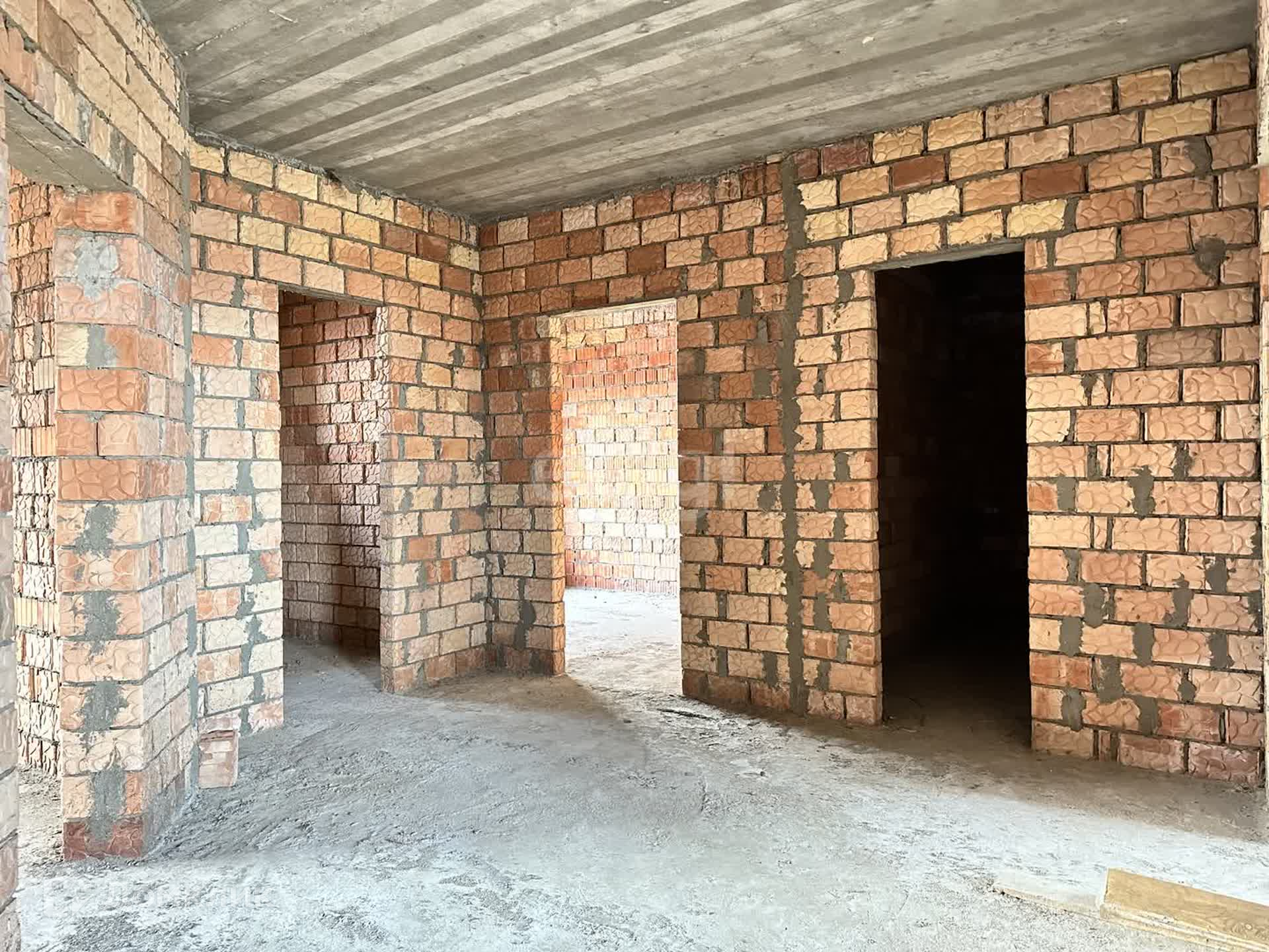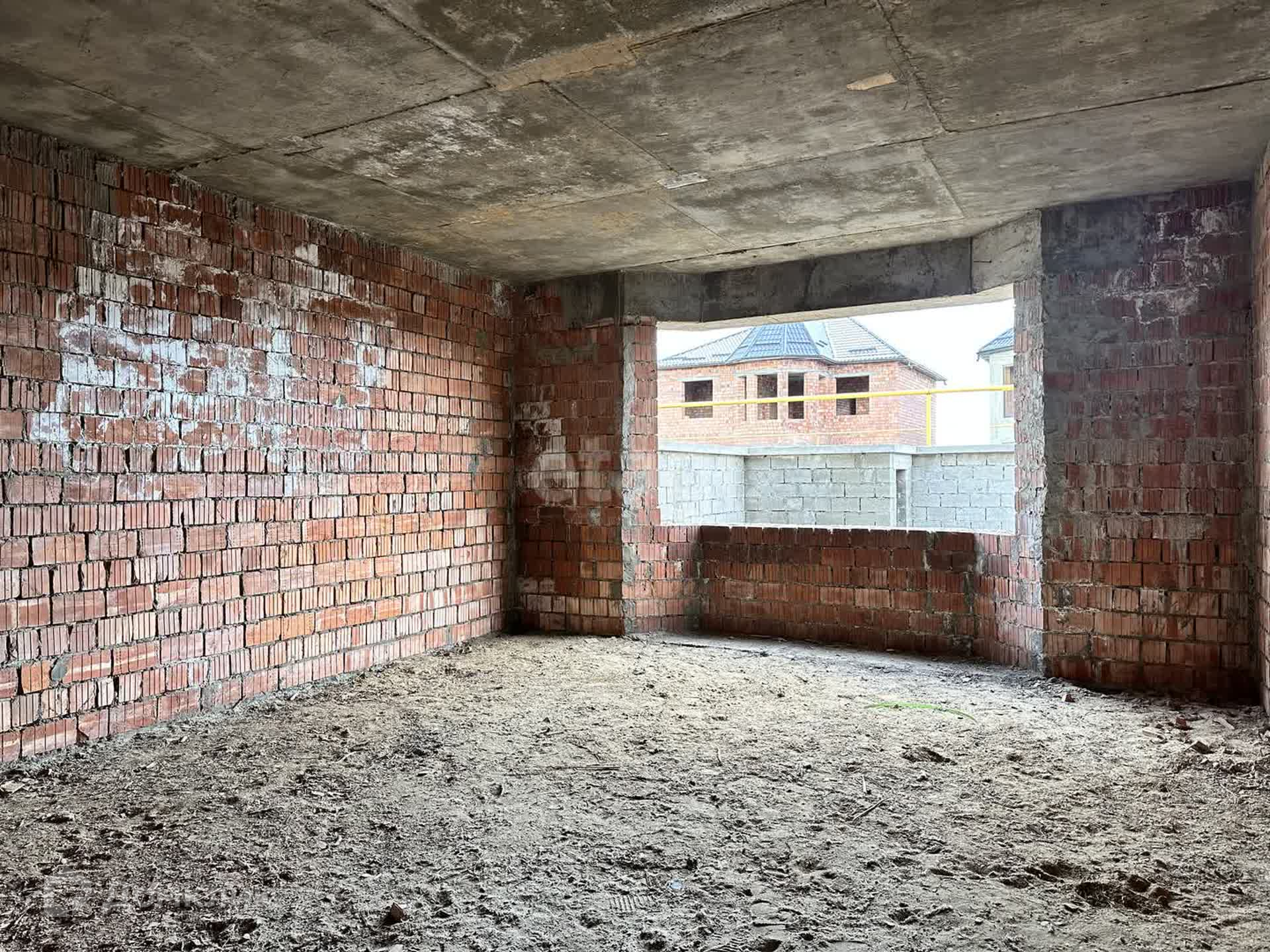 Дом в каркасном виде капитального строения. Стены из красного кирпича. Установлена крыша.