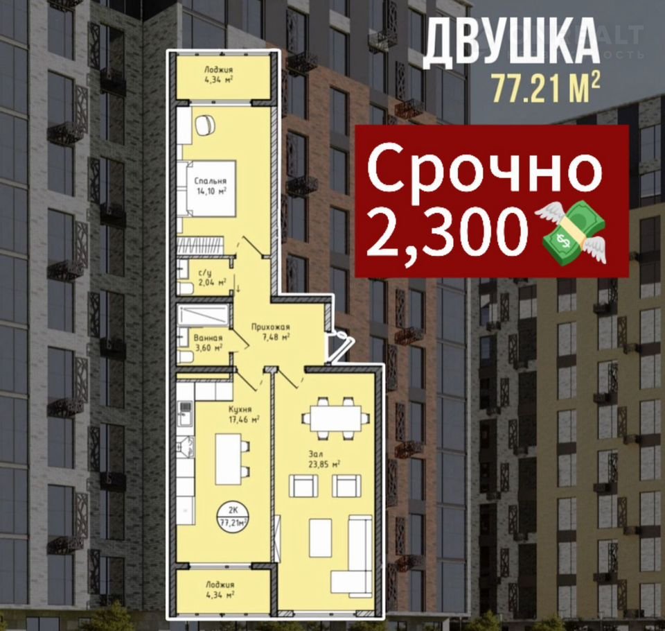 2-комнатная квартира, 77 м2, этаж 7 / 16, на продажу в Махачкале, Хушетское шоссе, 4