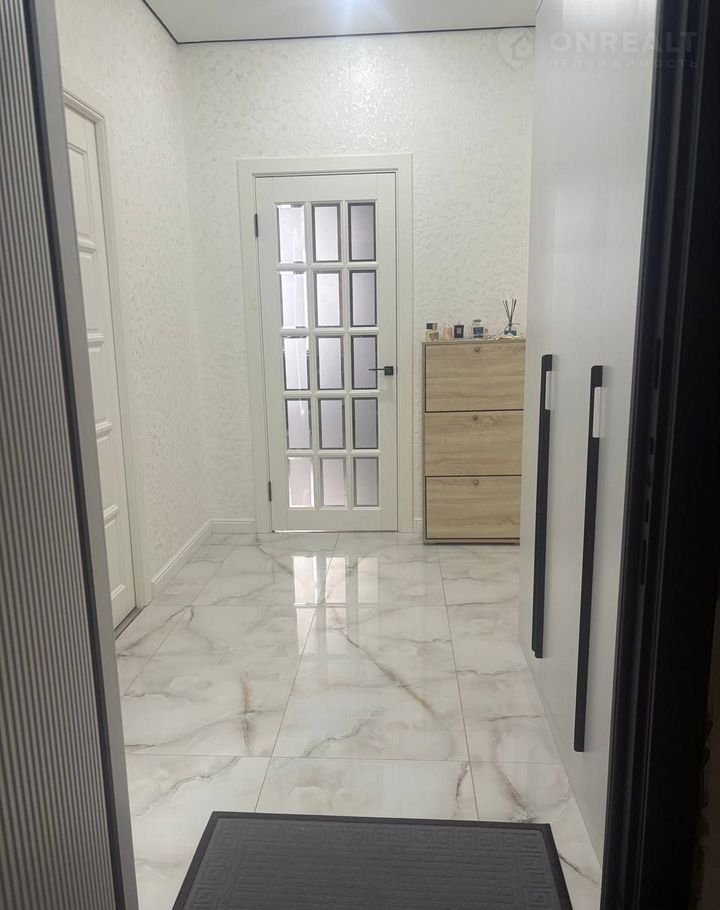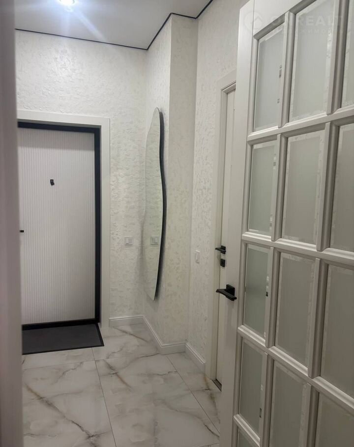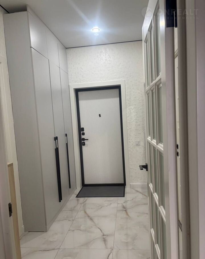 Прихожая отделана качественным кафелем и обустроена вместительным встроенным шкафом на всю длину стены, украшенным декоративной отделкой стен.