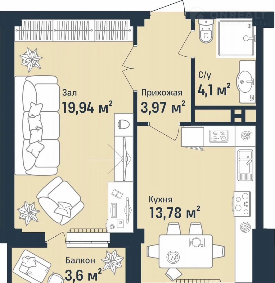 Общая площадь 45.4 м2