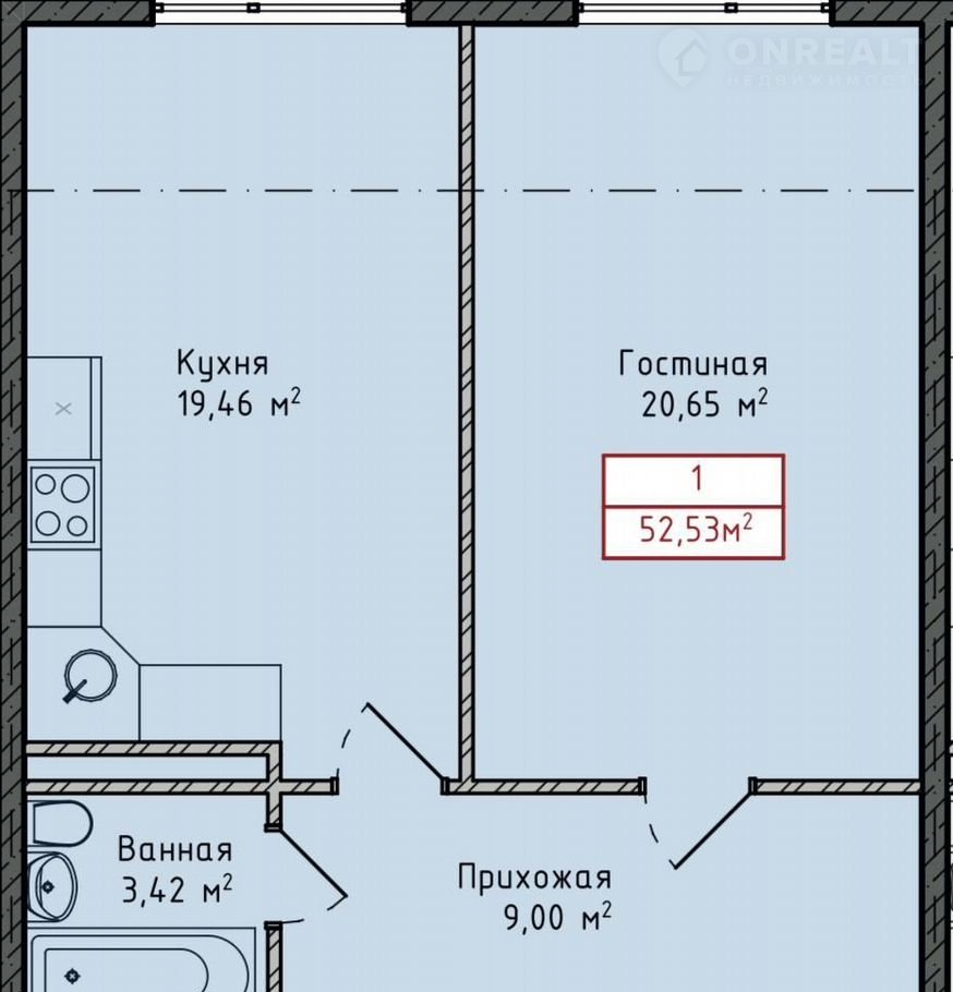 Общая площадь 52.5 м2