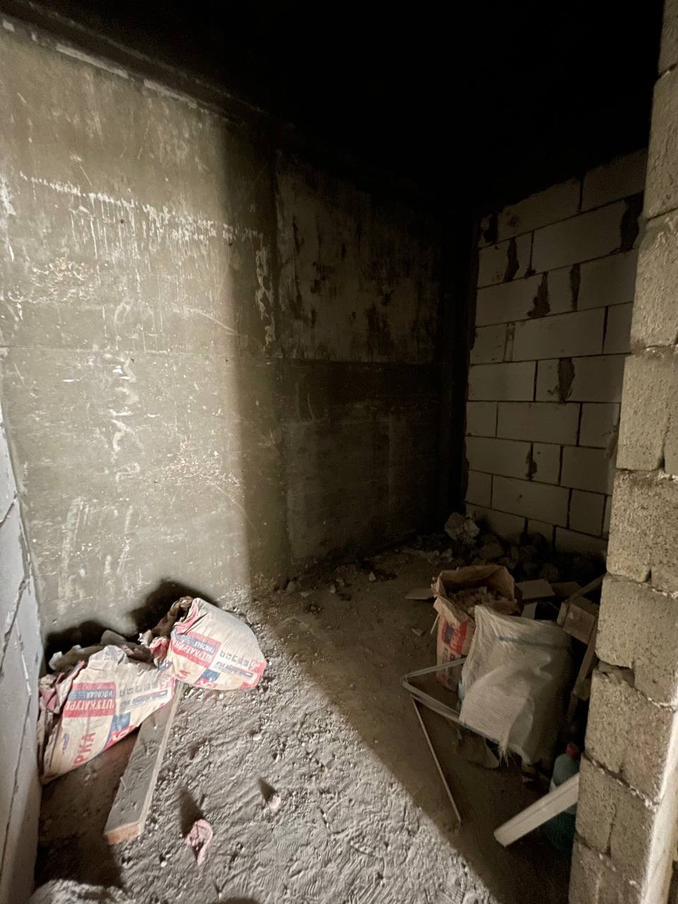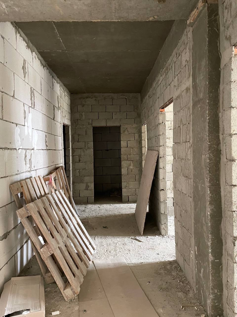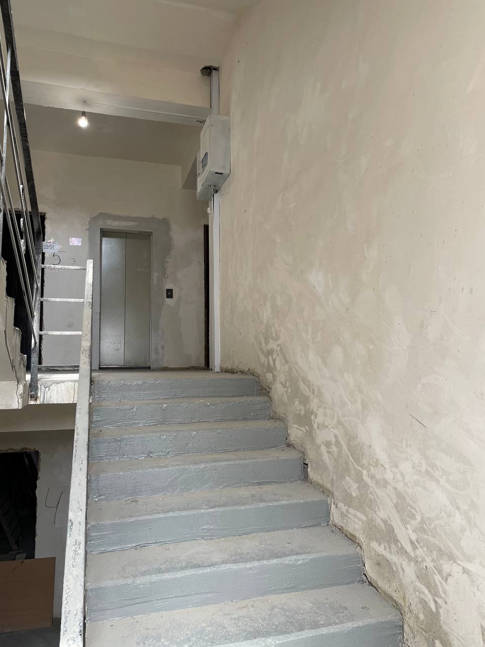 Большие лестничные площадки, с кафелем на полу. На лестнице наливной пол. В доме функционирует большой грузопассажирский лифт. Дом завершенный и частично заселенный.