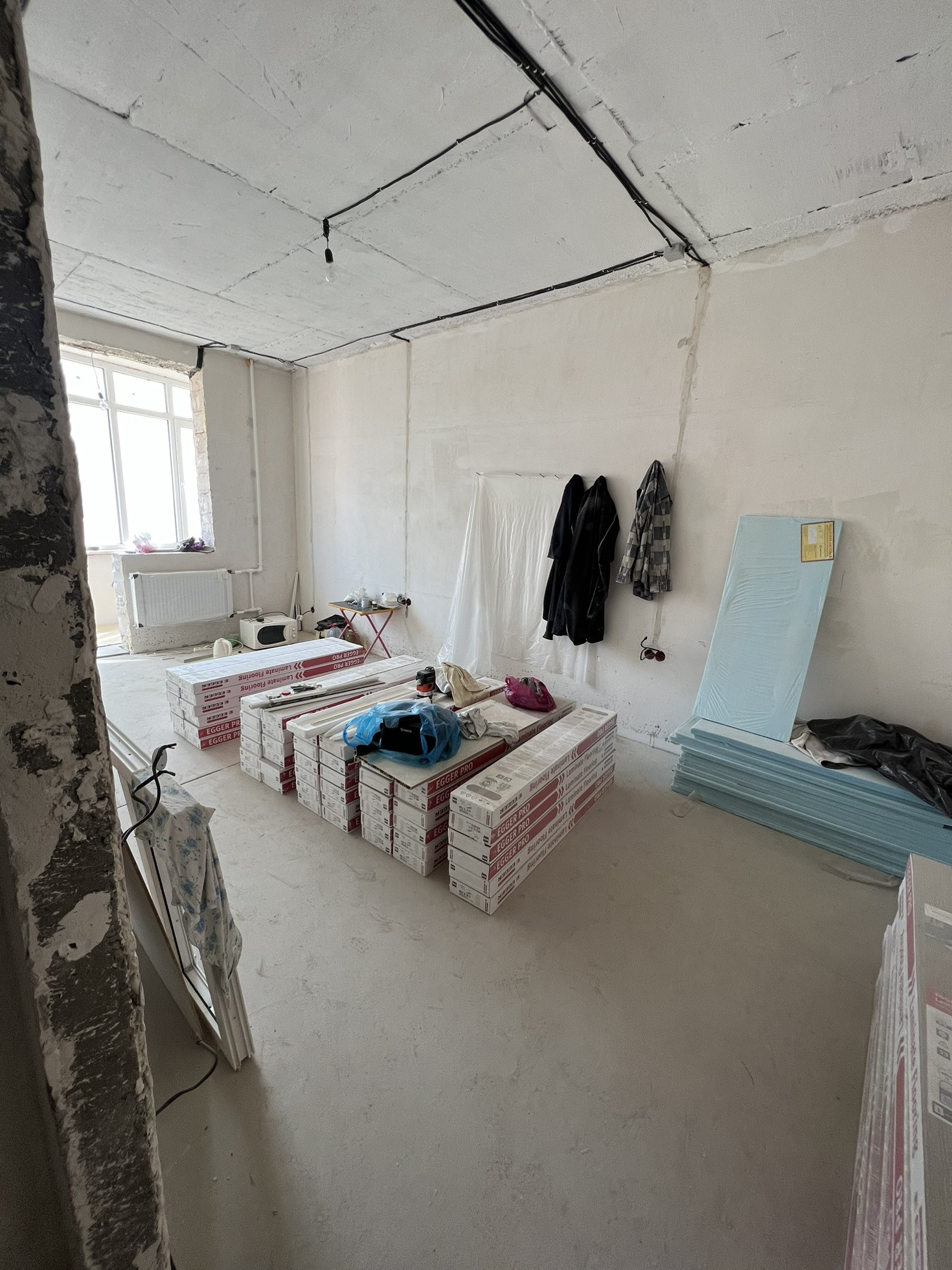 Купленный ламинат и двери с наличниками  двух сторон , петли и ручки все уже куплено лежит.