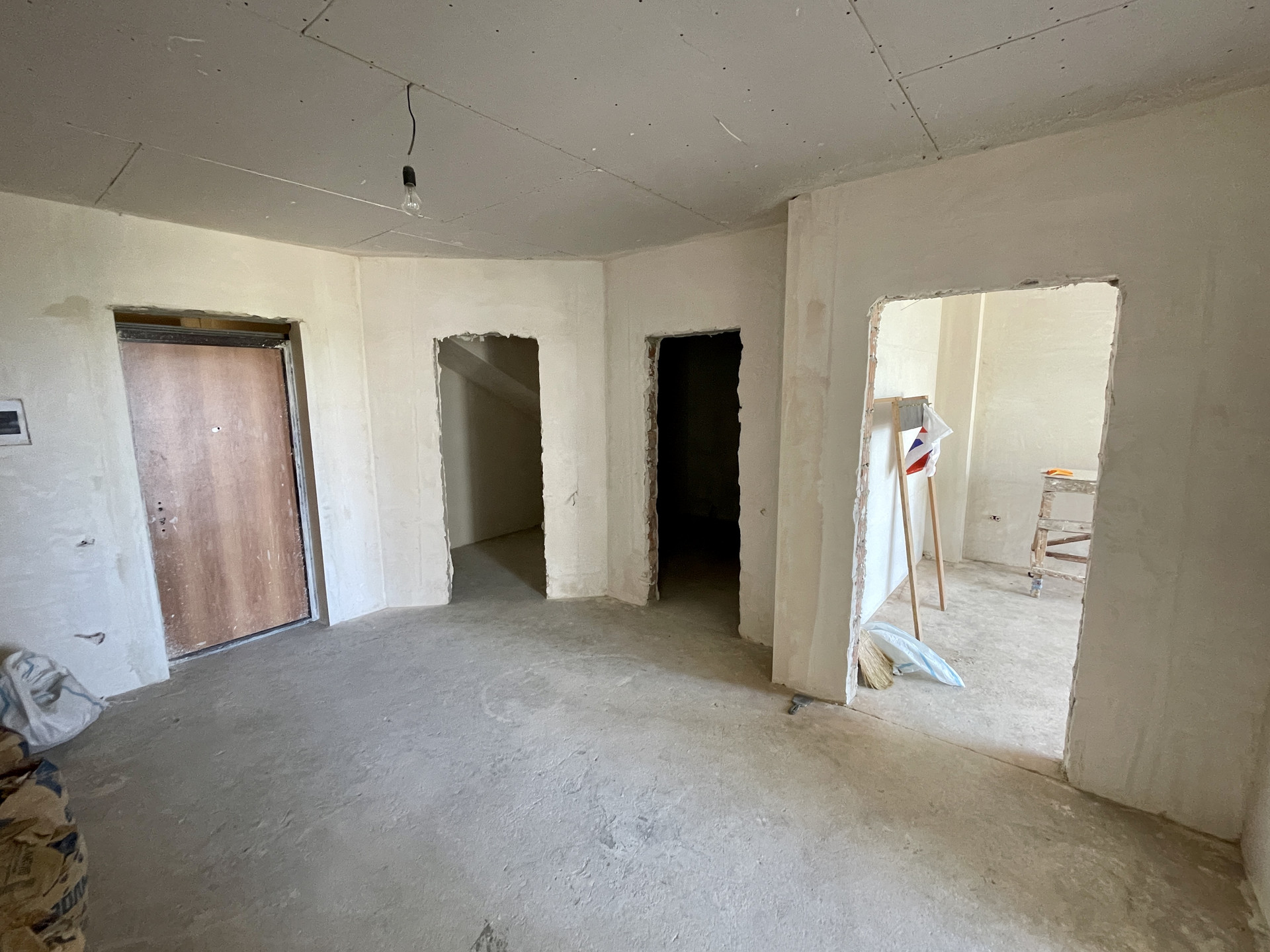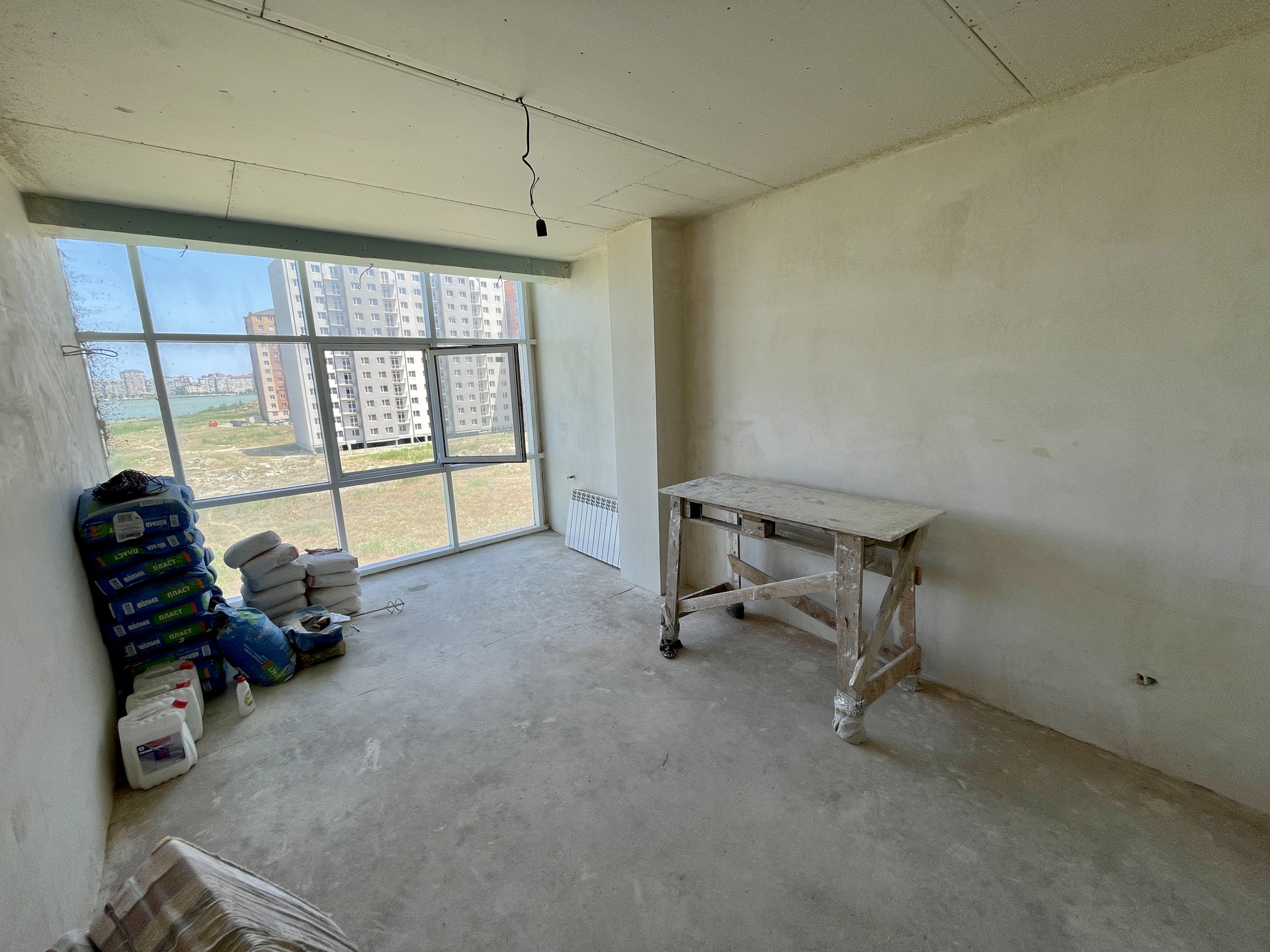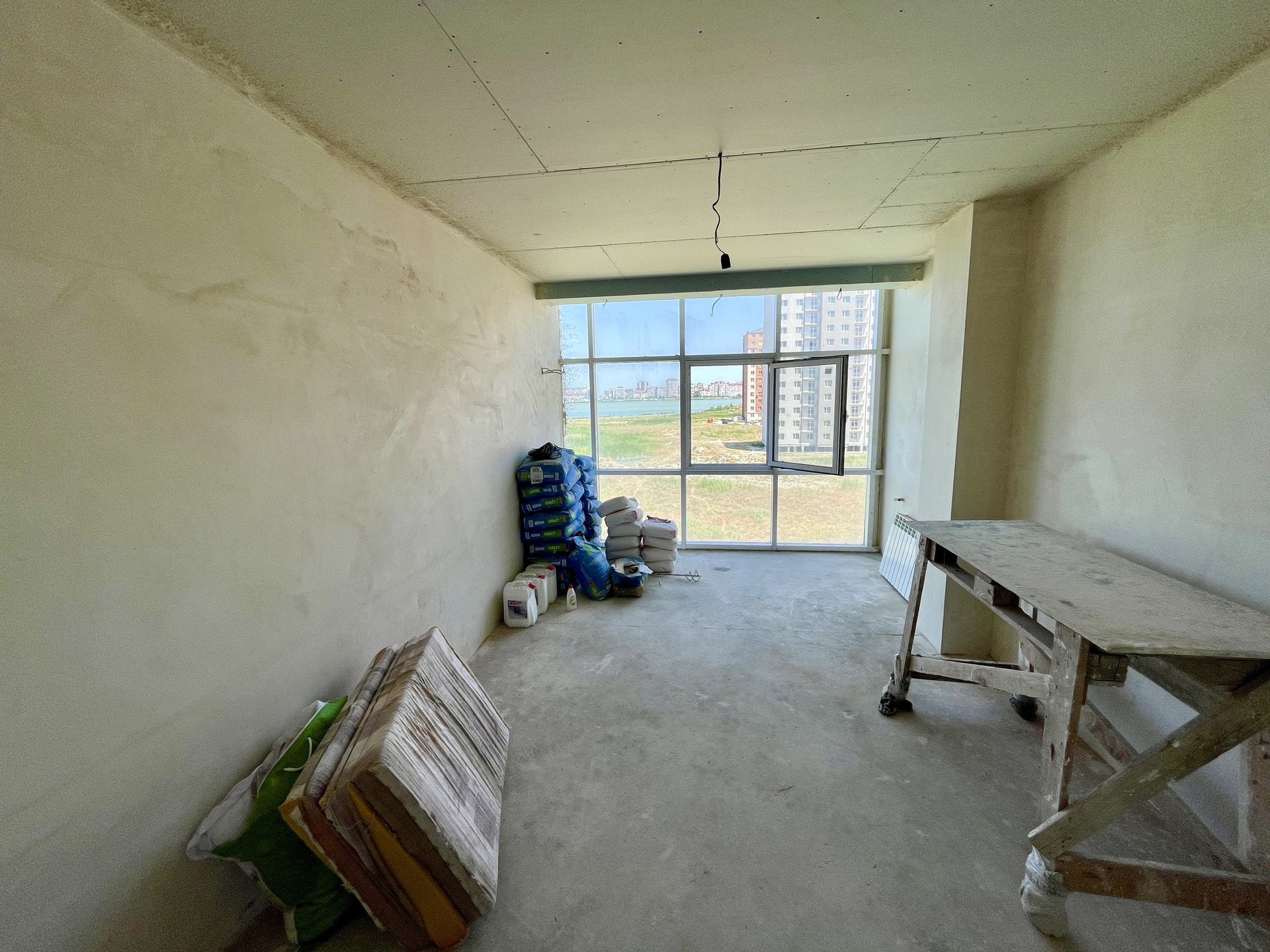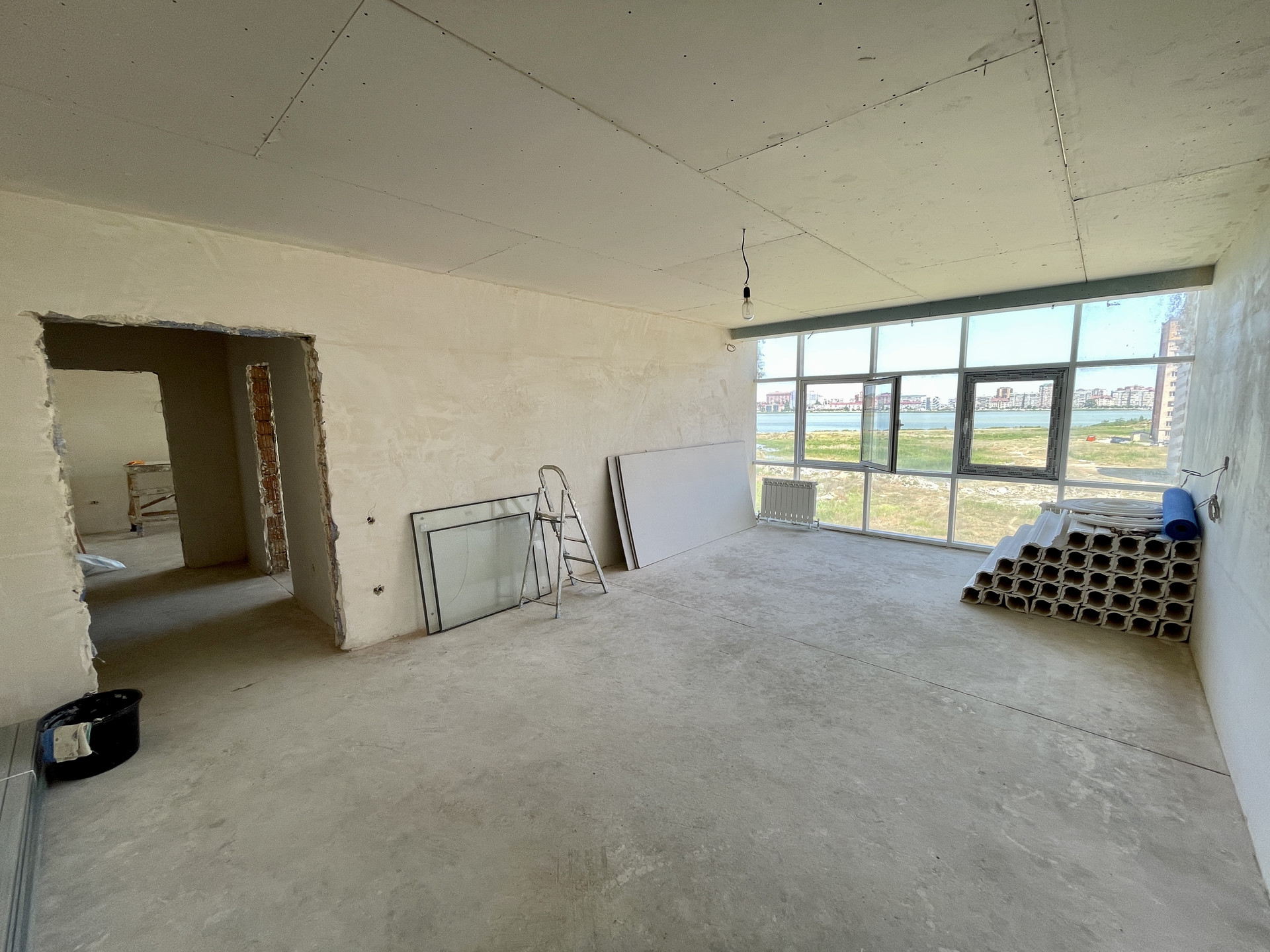 Квартира односторонняя. Потолки 2.7м. утеплены и обшиты гипсокартоном. Комнаты широкие с соблюдением пропорции. Все черновые работы выполнены! А именно, стяжка пола, шпаклевка под обои или покраску(на Ваш выбор), отопление установлено, теплые полы в кухне, под окнами, в ванной, в прихожей. Много естественного освещения. За счёт всего этого квартира визуальна еще просторнее. В коридоре есть место под гардеробную, либо кладовку. На видео видно, место для кладовой там много за счет пространства под лестницей. Санузел общий, просторный. Большая вместительная кухня(23м2). Во всех комнатах панорамные окна с видом на озеро Ак Гёль.
