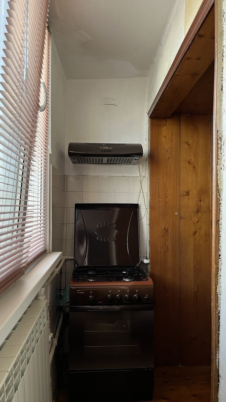 Остаются большие встроенные шкафы в прихожей и на лоджии, компьютерный стол, большой раздвижной шкаф в спальне, вся кухня и техника.